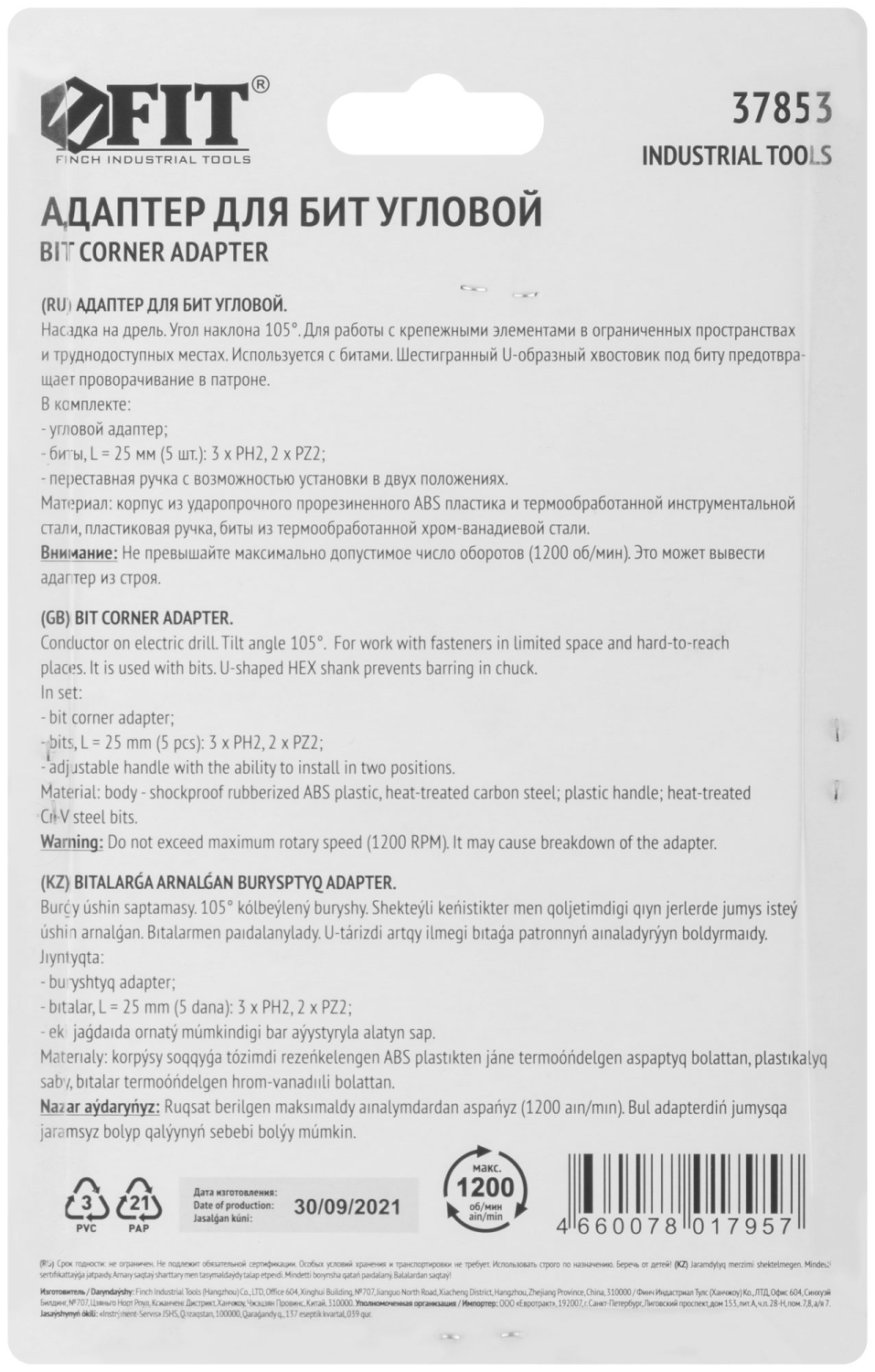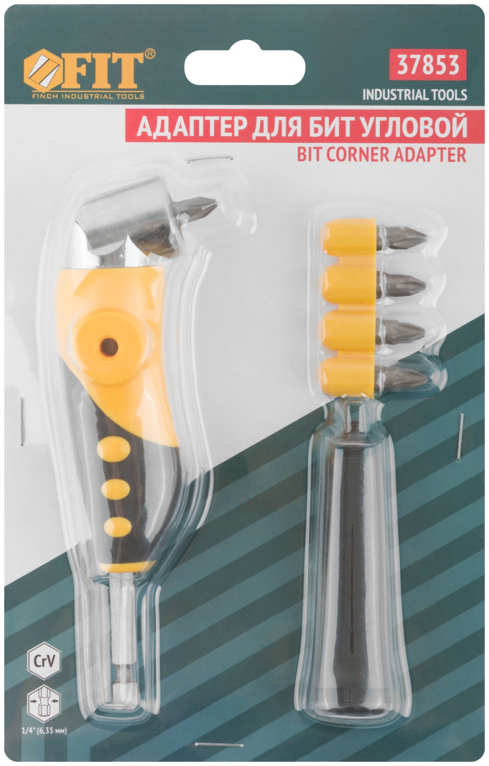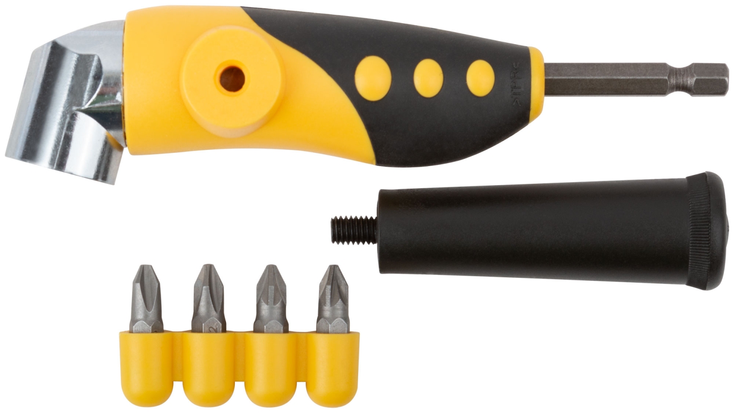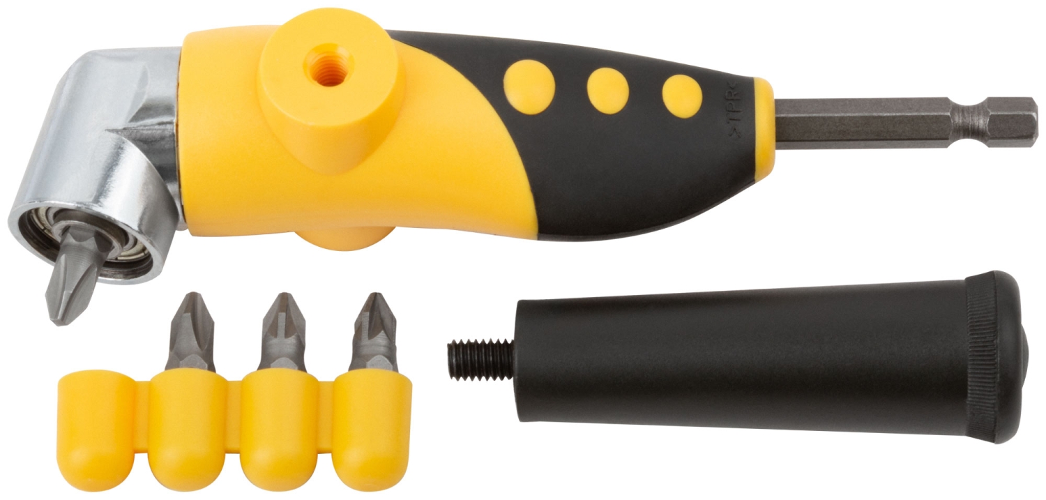 Адаптер для бит. Угол 105°. Для работы с электродрелями и шуруповертами. Переставная ручка. В комплекте 4 биты из CR-V стали PH2, PH2, PZ2, PZ2. Материал: корпус из ударопрочного ABS пластика, пластиковая ручка. Упаковка: блистер.