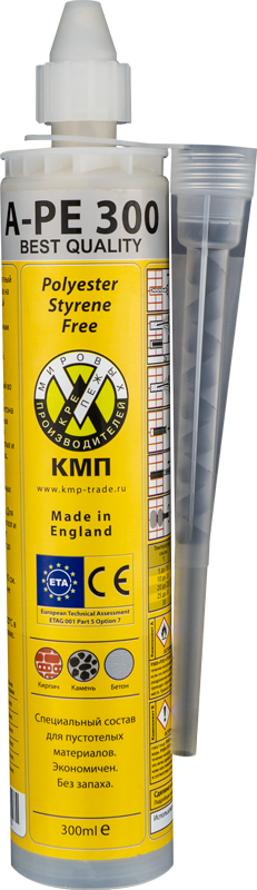 Двухкомпонентный синтетический состав на основе полиэстера без стирола. Химический анкер КМП A-PE 410 на основе полиэстера, применяется для установки резьбовых шпилек при создании точки крепления для средних нагрузок. Используется для проведения работ по организации анкерных креплений в различных видах бетона и кирпича, натурального камня, в пустотелых строительных материалах. Сертифицирован ЕТА с опцией 7 для применения в бетоне с резьбовыми стержнями размером М8,М10, М12, М16, М20, М24. Для анкеровки по строительным материалам с хрупкой или пустотелой структурой используют резьбовые шпильки М6,М8, М12 совместно с сетчатыми гильзами. Химический инъекционный анкер торговой марки КМП серия A-PE 410 представляет собой надежный клеевой раствор специально разработанный для пустотелых материалов. Двухкомпонентный клеевой состав для химической анкеровки на основе классической реактивной смолы производится в картриджах емкостью 410 мл..