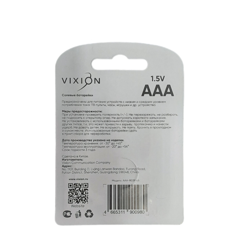 Батарейка солевая R03P-AAA 4шт VIXION подходит для простейших электронных устройств с малым и умеренным потреблением тока: маленьких приёмников, карманных фонариков, простых электронных часов, пультов дистанционного управления, тестеров и других устройств. Основные преимущества перед алкалиновыми батарейками – ценовая доступность и легкий вес. Выполнены в корпусе цилиндрической формы, с напряжением в полтора вольта, относятся к типа ААА. Элемент питания легко прослужит месяцы, а то и годы маломощному устройству. Покой и отдых продлевает срок эксплуатации батарейки этого типа, а если потрясти или даже постучать об руку, то их можно реанимировать (разравниваются комки электролита, и батарейки способны еще немного прослужить). Солевые батарейки Vixion - отличное соотношение между ценой и качеством. Элементы питания имею надёжную герметизацию. Энергоемкие источники работают в температурном режиме от -20° до +54°. Подлежат долгому хранению – 3 года.