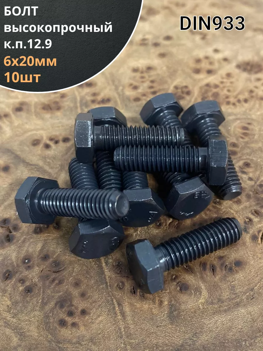 Болт М6х20 мм, DIN933, высокопрочный к.п. 12.9, 10шт.