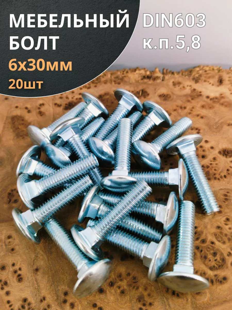 Болт мебельный М6х30 мм полукруглая головка DIN 603, 20 шт.