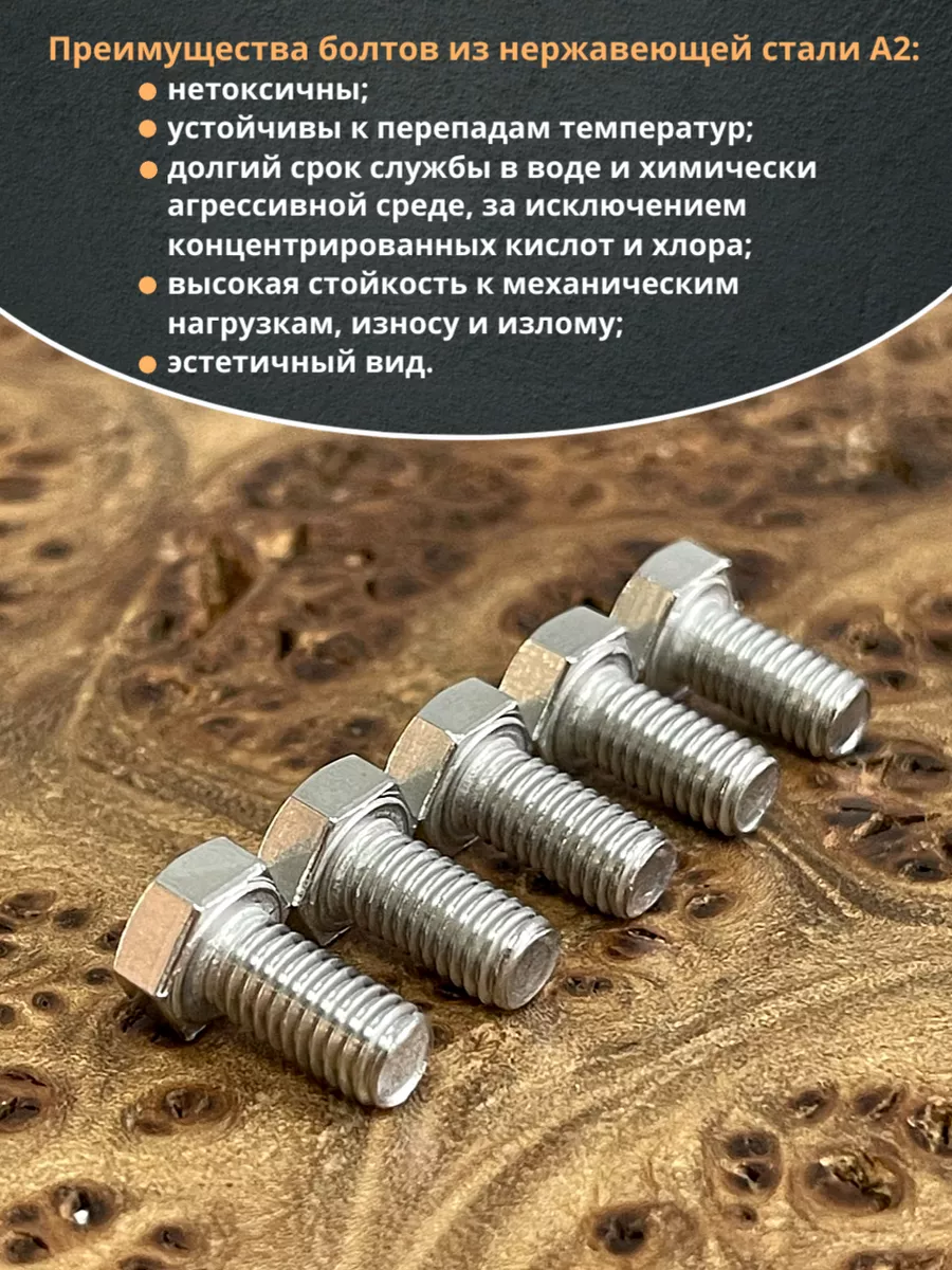 Материалом для болта служит нержавеющая сталь класса A2. У изделия есть цилиндрический стержень c полной резьбой и шестигранная головка. Шляпка передает крутящий момент от ключа к крепежу при завинчивании. Для создания прочных резьбовых соединений крепеж используется в комбинации с шайбой и гайкой или завинчивается в отверстия с нарезанной резьбой. Чтобы исключить электрохимическую коррозию, шайбы с гайкой делаются из коррозионно-устойчивой стали либо нейтральных полимерных материалов.