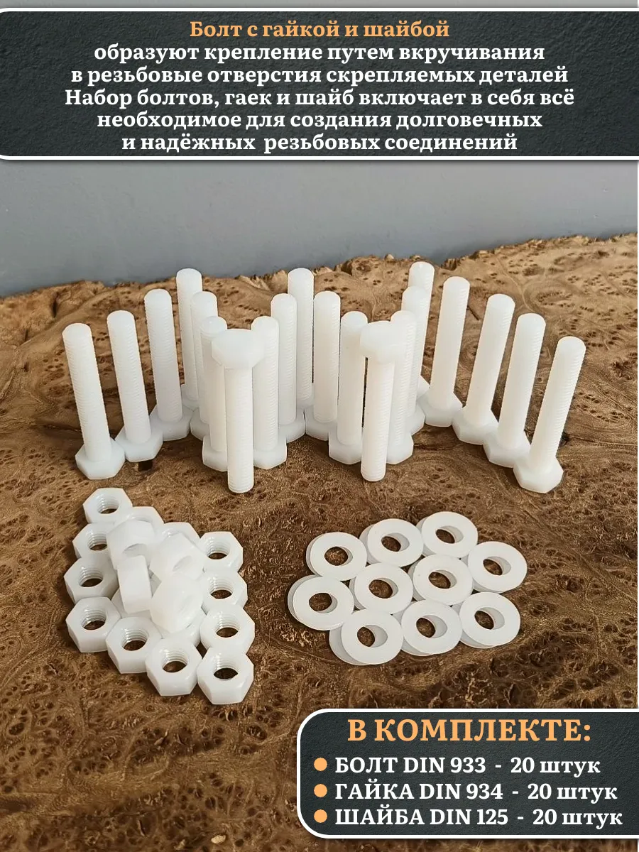 Болт полиамидный 10х60 мм DIN 933 с гайкой и шайбой, по 20 шт.