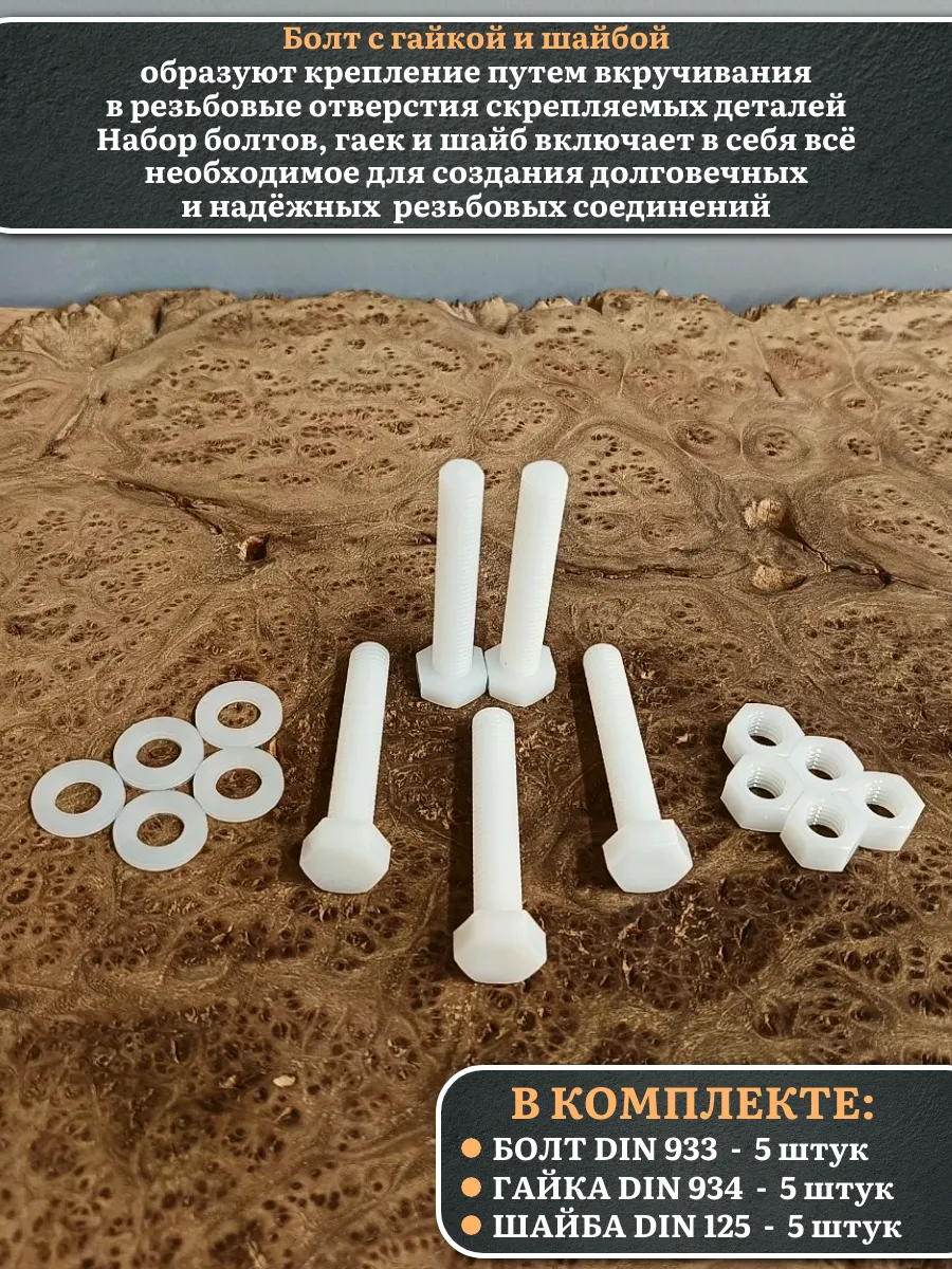 Болт полиамидный 10х60 мм DIN 933 с гайкой и шайбой, по 5 шт.