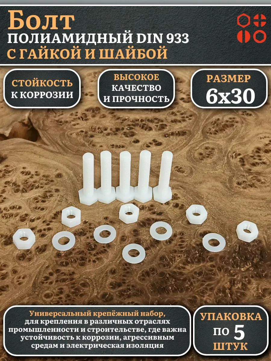 | Болт полиамидный 6х30 мм DIN 933 с гайкой и шайбой, по 10 шт. | бп630933наборГШф10 | 1 шт. |