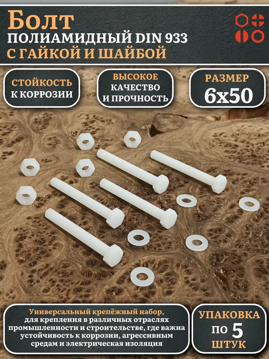 Болт полиамидный 6х50 мм DIN 933 с гайкой и шайбой, по 5 шт.