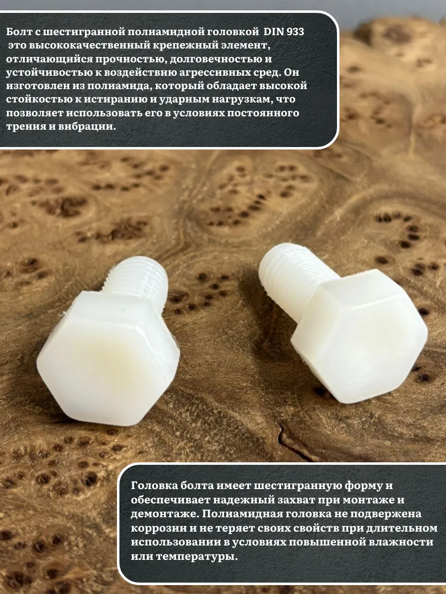 Болты из полиамида устойчивы к воздействию щелочей и кислот. Они не боятся атмосферного давления, ультрафиолетового излучения, агрессивной среды и низких температур.