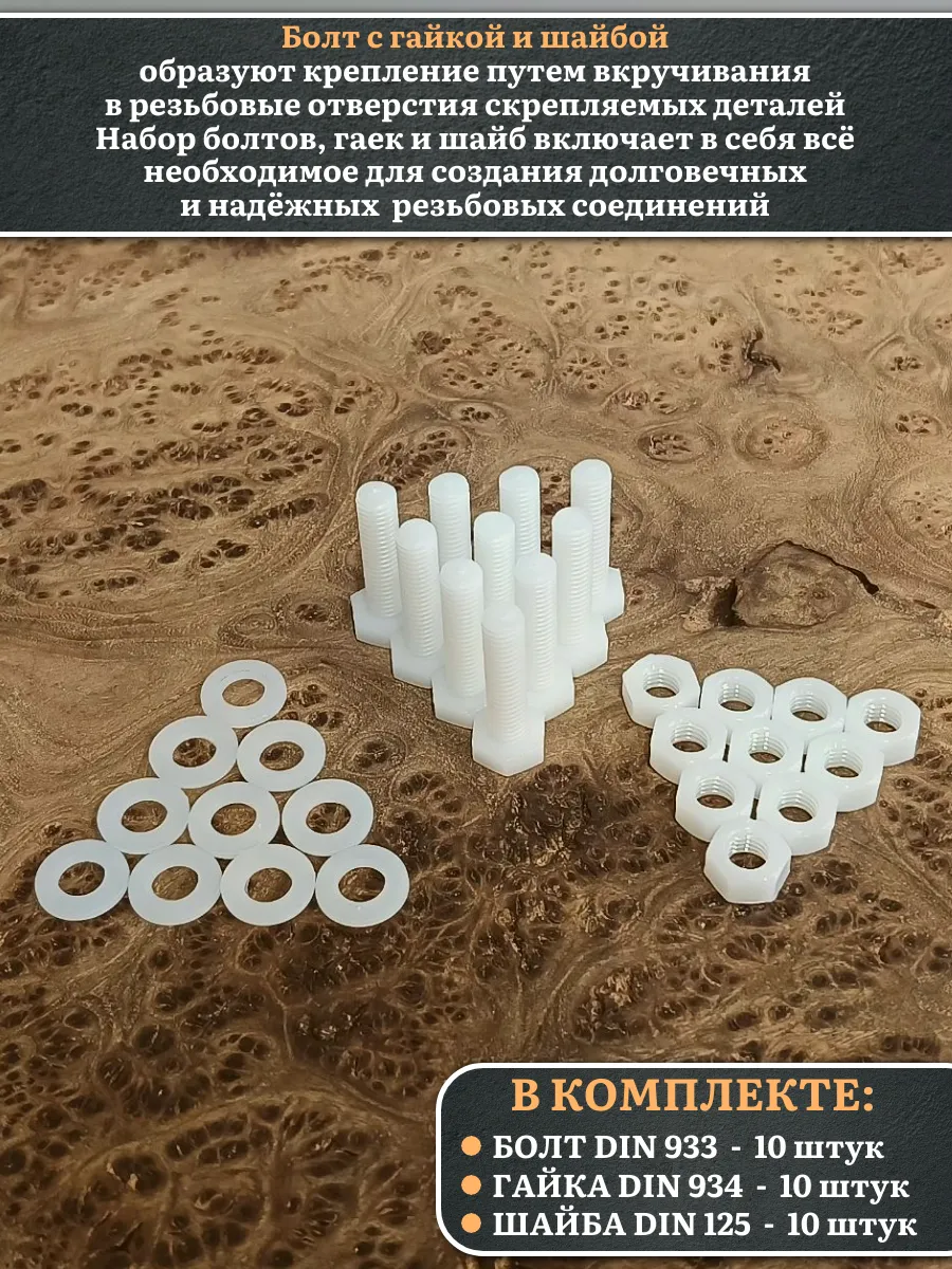 Болт полиамидный 8х30 мм DIN 933 с гайкой и шайбой, по 10 шт.