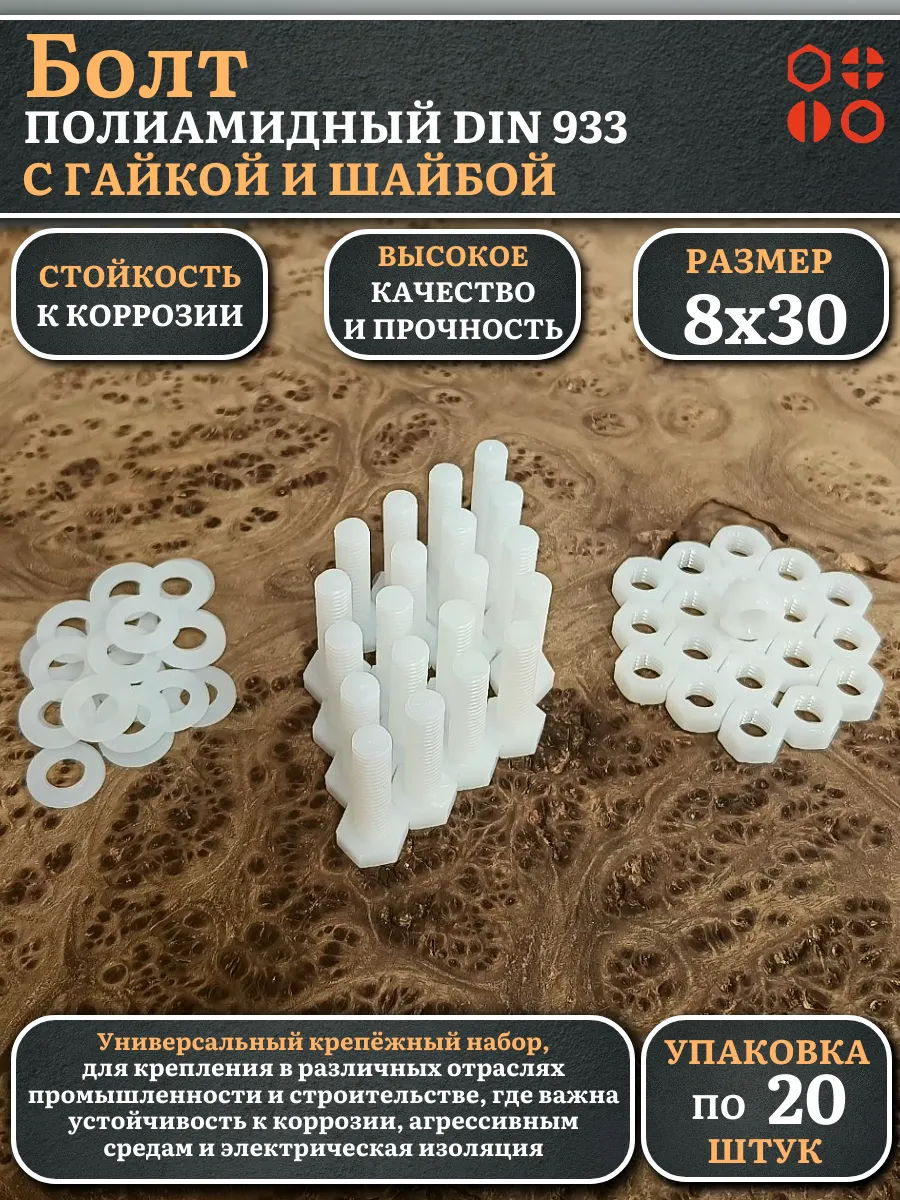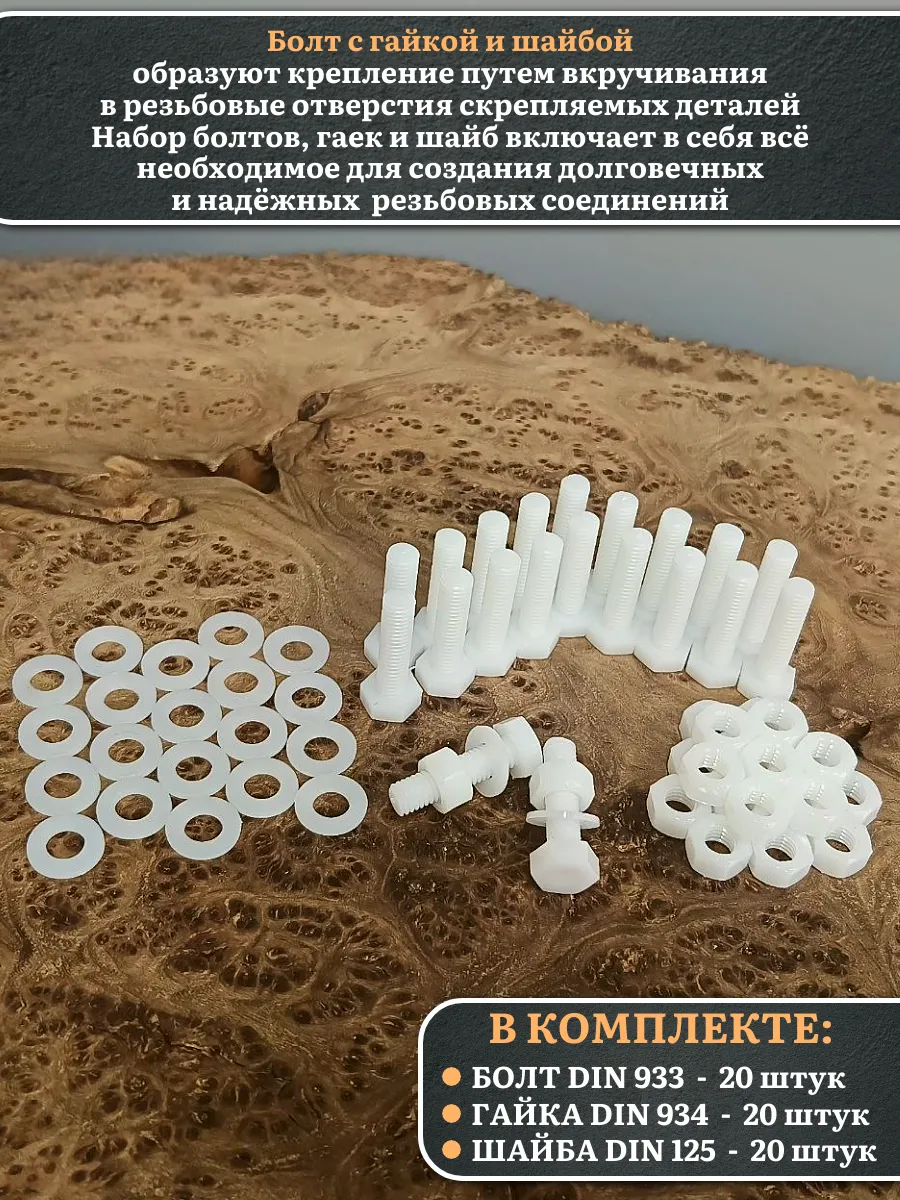 Болт полиамидный 8х30 мм DIN 933 с гайкой и шайбой, по 20 шт.