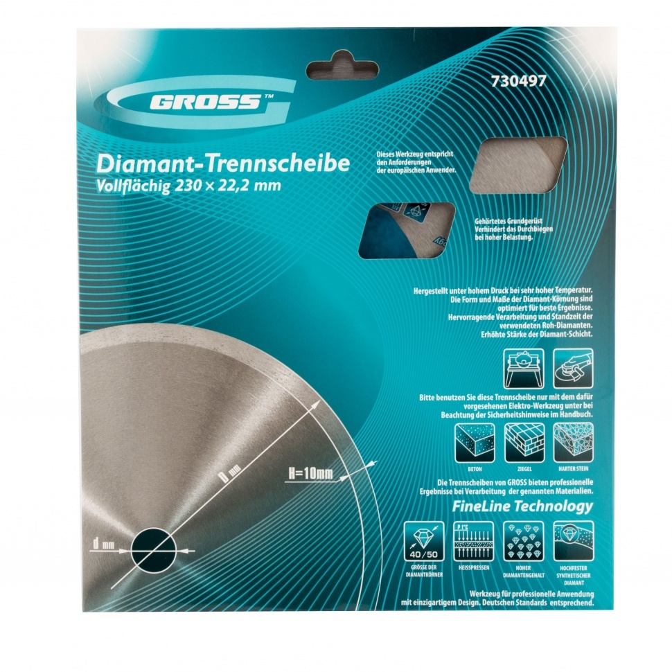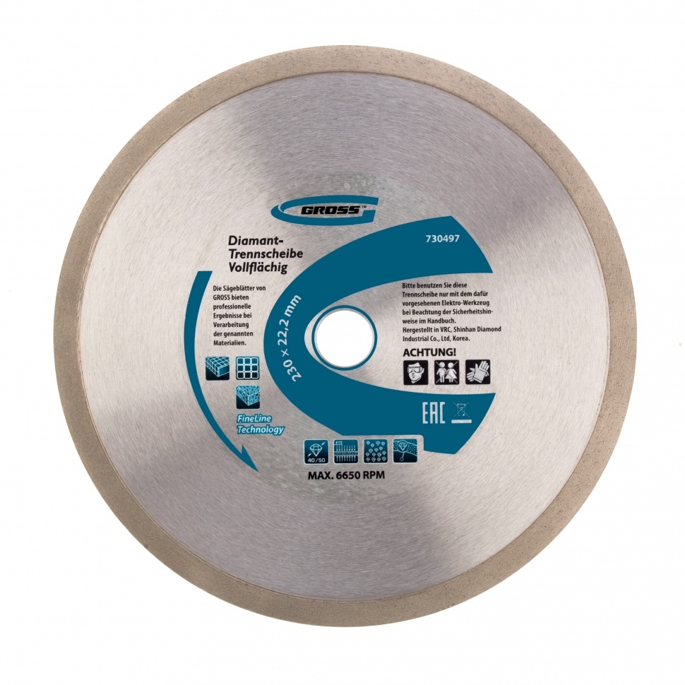 Сплошной алмазный диск Gross ф230х22,2 мм 730497 предназначен для мокрого резания гранита и керамогранита, плитки, мрамора и камня. Он подходит для эксплуатации с профессиональными УШМ или плиткорезами с посадочным диаметром 22,2 мм, рассчитан на большой объем работ. Сплошная конструкция не оставляет трещин на материалах, поэтому срез получается аккуратным и ровным. Алмазную резку рекомендуется проводить с водяным охлаждением диска для защиты от перегрева и качественного отвода пыли.Преимущества Высокая надежность &mdash диск изготовлен методом горячего прессования. Эффективность и скорость резки &mdash в качестве режущих сегментов используются крупные синтетические алмазы 40-50 мкм. Широкая рабочая часть 10 мм с высокой концентрацией алмазов &mdash производительность остается на высоком уровне даже при быстром резе. Сопротивление перегреву и перегрузкам &mdash металлическая связка изготовлена из качественных компонентов (кобальта, серебра и др.). Корпус из стали 65Mn с добавкой марганца &mdash хорошие пружин