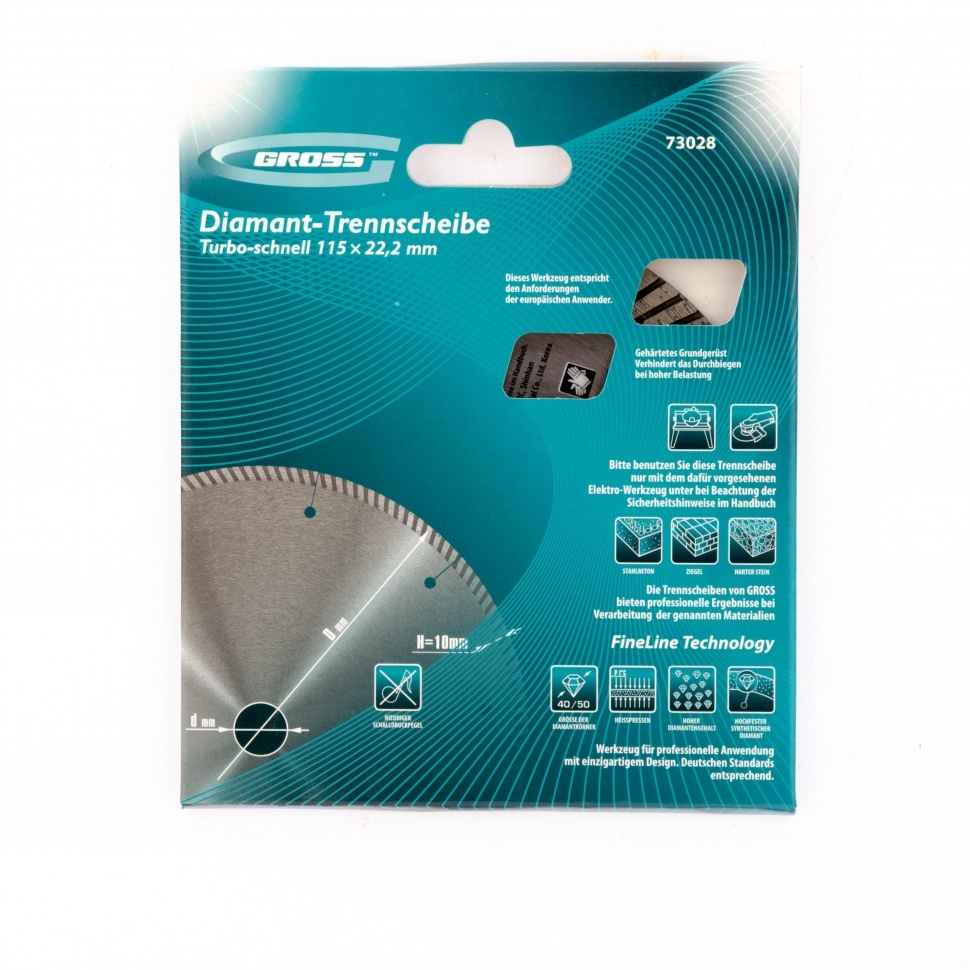 Алмазный диск Gross ф115х22,2 мм 73028 турбо с лазерной перфорацией применяется для сухого резания твердых материалов: бетона, в том числе свежего, железобетона, кирпича, гранита, камня и песчаника. Возможность работы с разными типами материалов обусловлена оптимально подобранной металлической связкой. Инструмент используется в качестве расходника на профессиональных УШМ. Лазерная перфорация обеспечивает усиленное охлаждение диска, поэтому он оптимален для интенсивной эксплуатации.Преимущества Турбированная форма рабочей части позволяет проводить быстрое резание сухим методом без необходимости использования водяного охлаждения. Диск отличается износостойкостью и высокой скоростью резки, благодаря режущей части с высокой концентрацией алмазов 40-50 мкм. В качестве связки используются только качественные компоненты (кобальт, серебро и др.), это позволяет повысить ее устойчивость к перегрузкам, перегреву и увеличить ресурс диска. Ширина рабочей части составляет 10 мм, поэтому инструмент обеспечивает высокий ресу