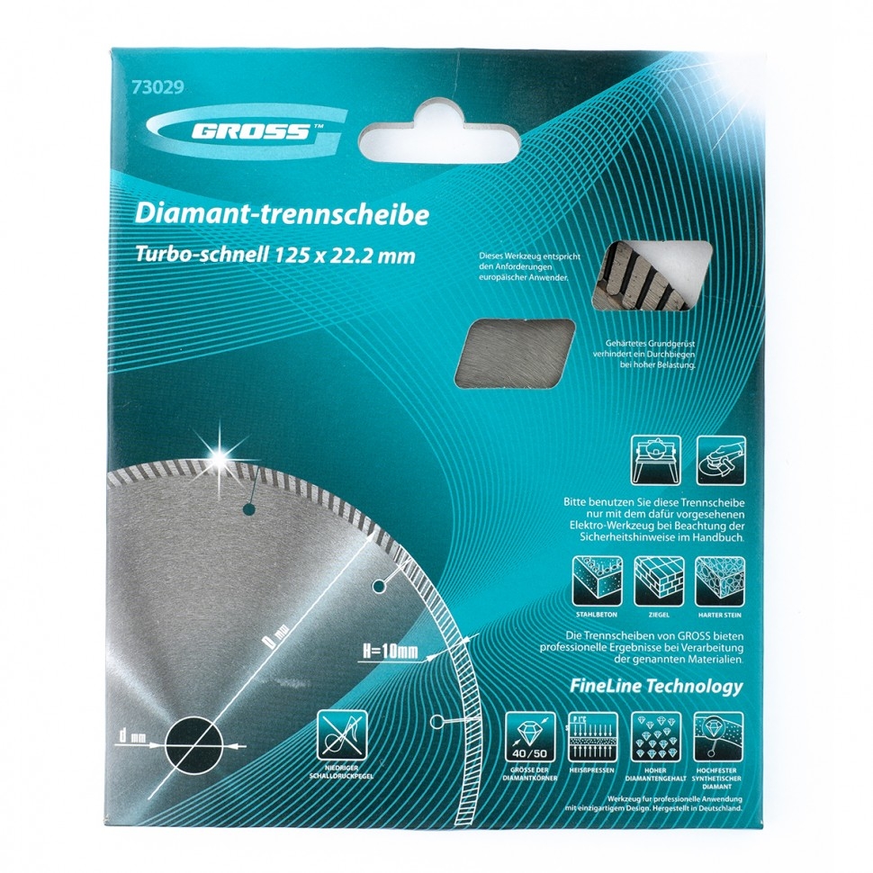 Алмазный диск Gross ф230х22,2 мм 73034 турбо с лазерной перфорацией применяется для сухого резания твердых материалов: бетона, в том числе свежего, железобетона, кирпича, гранита, камня и песчаника. Возможность работы с разными типами материалов обусловлена оптимально подобранной металлической связкой. Инструмент используется в качестве расходника на профессиональных УШМ. Лазерная перфорация обеспечивает усиленное охлаждение диска, поэтому он оптимален для интенсивной эксплуатации.Преимущества Турбированная форма рабочей части позволяет проводить быстрое резание сухим методом без необходимости использования водяного охлаждения. Диск отличается износостойкостью и высокой скоростью резки, благодаря режущей части с высокой концентрацией алмазов 40-50 мкм. В качестве связки используются только качественные компоненты (кобальт, серебро и др.), это позволяет повысить ее устойчивость к перегрузкам, перегреву и увеличить ресурс диска. Ширина рабочей части составляет 10 мм, поэтому инструмент обеспечивает высокий ресу
