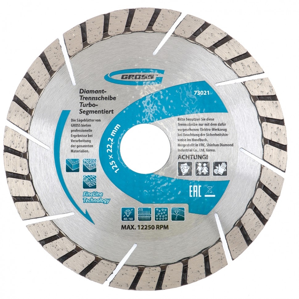 Алмазный турбо-сегментный диск Gross ф230х22,2 мм 73026 для сухого резания устанавливается на УШМ в качестве оснастки для проведения отрезных работ. Диск с турбированной рабочей частью универсален по своему применению и его можно использовать для резки камня, гранита и кирпича, свежего бетона, а также слабоармированного железобетона. Он пригодится для интенсивных работ с профессиональным инструментом.Преимущества Турбо-сегментная форма &mdash резание материалов происходит быстро, водяное охлаждение не требуется, в т.ч. армированного бетона. Надежность &mdash диск выполнен методом горячего прессования. Износостойкость и скорость реза до 6650 об/мин &mdash режущая часть выполнена из крупных алмазов размером 40-50 мкм. Рабочая часть 10 мм с высокой концентрацией алмазных зерен &mdash диск идеально подходит для выполнения больших объемов работ. Оптимально подобранная металлическая связка &mdash серебро, кобальт и другие составляющие значительно повышают ресурс диска, позволяют резать материалы разной плотности.