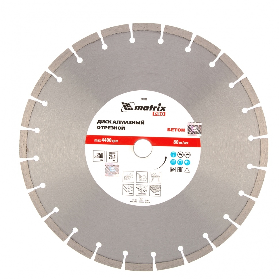 Диск алмазный Matrix PRO «Железобетон» 731103, ф350 х 25,4 мм, используется с профессиональными швонарезчиками, ручными бензорезами и специальными станками для сухого и мокрого реза различных материалов. Позволяет работать по тяжелому и армированному бетону, камню, тротуарной плитке, силикатному кирпичу, абразивному песчанику и другим особо твердым материалам. Диск характеризуется высокой производительностью и подходит для интенсивного применения.Преимущества Алмазные сегменты приварены лазером, поэтому выдерживают сверхнагрузки и сохраняют работоспособность даже при резке армированного бетона. Благодаря сегментному строению, обеспечивающему охлаждение и отвод шлама, диск может работать как с водяным охлаждением, так и без него. Увеличенная концентрация алмазов в рабочем слое и ширина режущей части 10 мм повышают производительность и ресурс диска. Оптимальное соотношение компонентов в металлической связке обеспечивает высокие режущие свойства, стойкость к перегреву и перегрузкам.