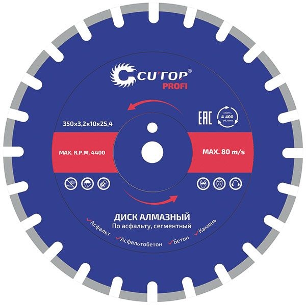 Промышленный алмазный диск Cutop Profi предназначен для сухой и мокрой резки асфальта, асфальтобетона и других высокоабразивных материалов. Используется в швонарезчиках и бензорезах. Благодаря широкому алмазному слою, обеспечивается быстрое резание и долгий срок службы.<br/>Режущая кромка высотой 10 мм состоит из сегментов, изготовленных с применением высококачественных технических алмазов повышенной прочности, приваренных методом пайки к телу диска. Диск отлично сбалансирован, это позволяет производить точные работы и продлить срок службы инструмента. Диск имеет дополнительное крепежное отверстие на корпусе, которое используется для лучшей фиксации диска и защиты от проскальзывания во время работы.<br/>Материал: инструментальная сталь, режущая кромка содержит порошок из технических алмазов. Упаковка: картонная коробка. <br/>Технические характеристики: Диаметр диска – 350 мм, посадочный диаметр – 25,4 мм, высота алмазных сегментов – 10 мм, толщина сегмента – 3,2 мм, количество сегментов – 21 шт.