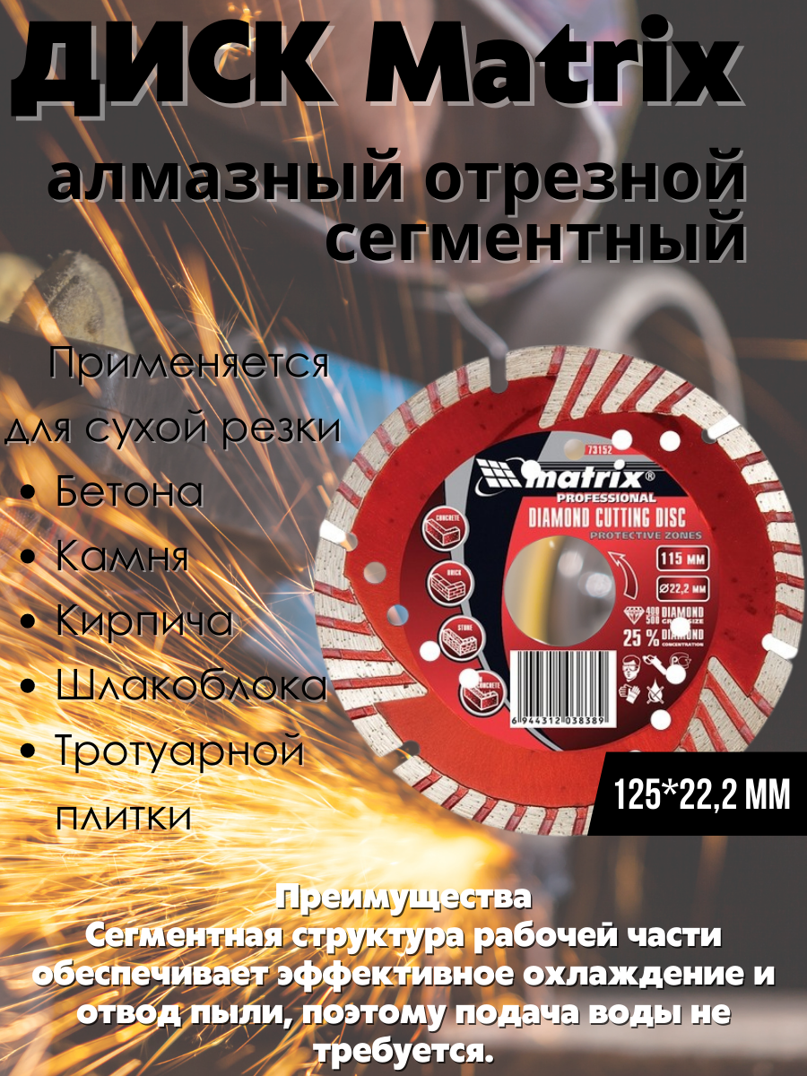 | Диск отрезной алмазный сегментный с защитн.сект. сухая резка 125х22,2 мм Matrix | 73153 | 1 шт. |