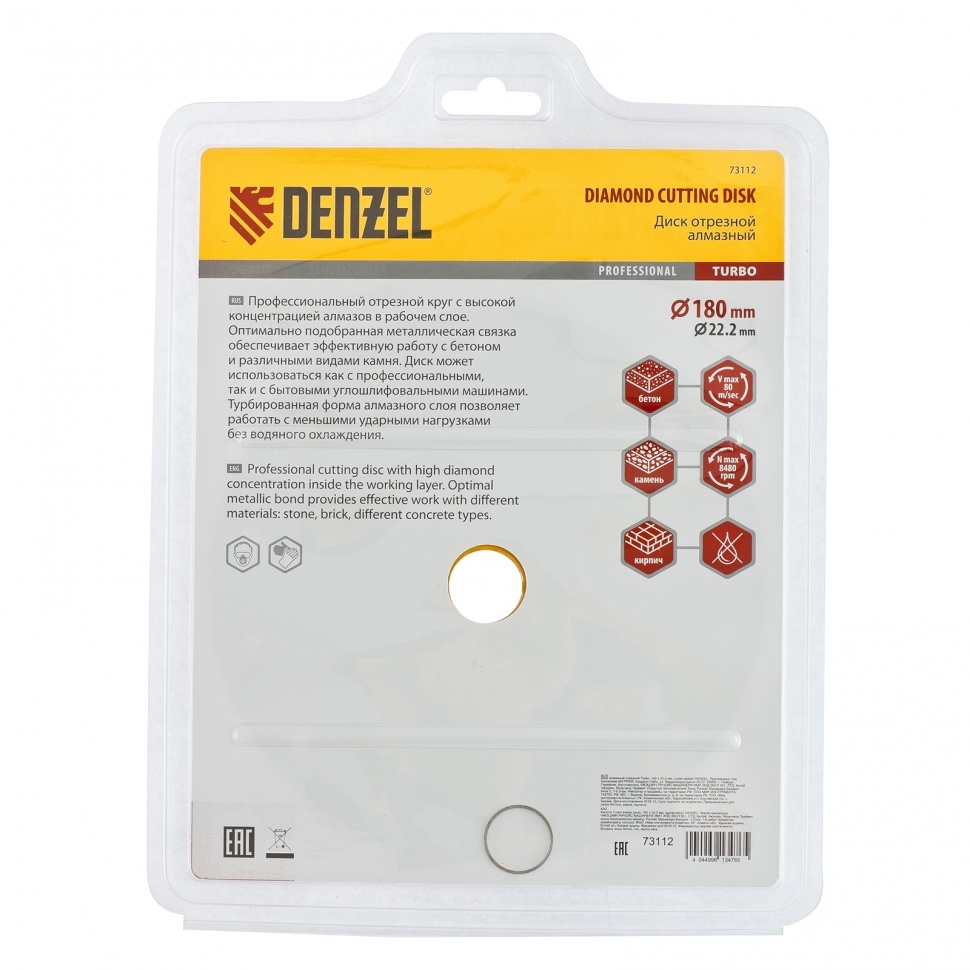 Отрезной алмазный диск Denzel Турбо ф180 х 22,2 мм 73112 рассчитан на сухое резание камня, кирпича, свежего и затвердевшего бетона, железобетона. Он используется в качестве оснастки на УШМ с посадочным отверстием 22,2 мм при проведении бытовых и профессиональных отрезных работ. Турбо диск режет снижает ударную нагрузку при резании материалов и не требует водяного охлаждения.Преимущества Качественная металлическая связка обеспечивает эффективность работы с плотными материалами, т.к. устойчивая к высоким температурам. Режущий слой шириной 7 мм с высокой концентрацией алмазов позволяет увеличить скорость реза и износостойкость диска. Диск изготовлен по технологии холодного прессования, поэтому отличается хорошими режущими свойствами.