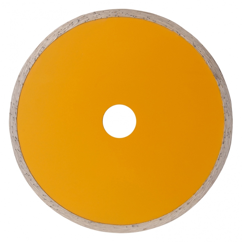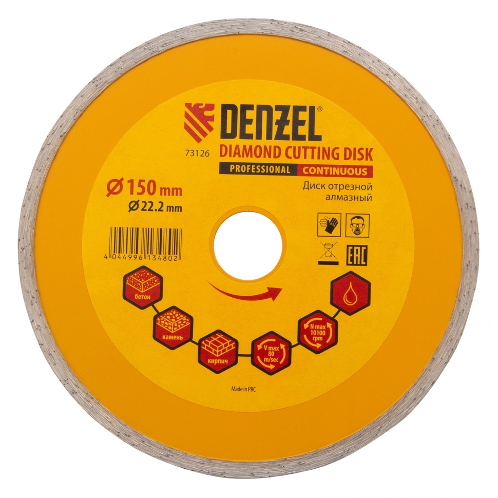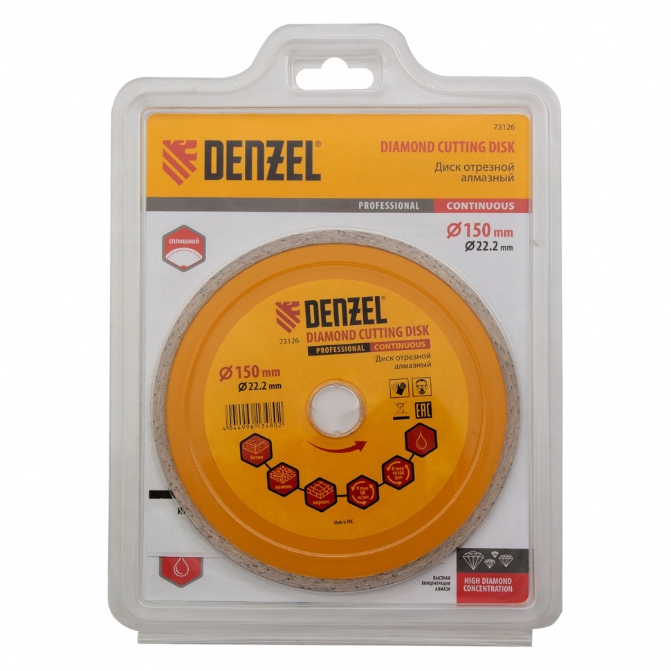 Отрезной алмазный диск Denzel Сплошной 73126, ф150 х 22,2 мм, используется для мокрого резания совместно с углошлифовальными машинами или плиткорезами с посадочным диаметром 22,2 мм. С его помощью режут камень, мрамор, керамогранитную и керамическую плитку. Диск отличается хорошей производительностью за счет высокой скорости реза, поэтому подходит для профессионального применения.Преимущества Сплошная конструкция обеспечивает эффективное выполнение большого объема работ даже при резании хрупких материалов. Режущая кромка шириной 7 мм позволяет получить аккуратный срез без зазубрин и сколов. Диск обладает высоким рабочим ресурсом благодаря увеличенной концентрации алмазов в рабочем слое. Отрезной диск изготовлен способом холодного прессования.