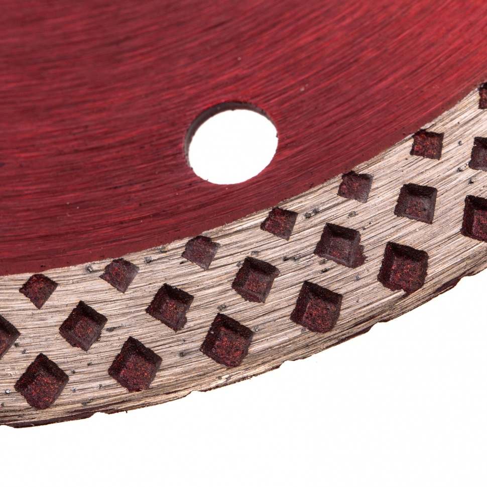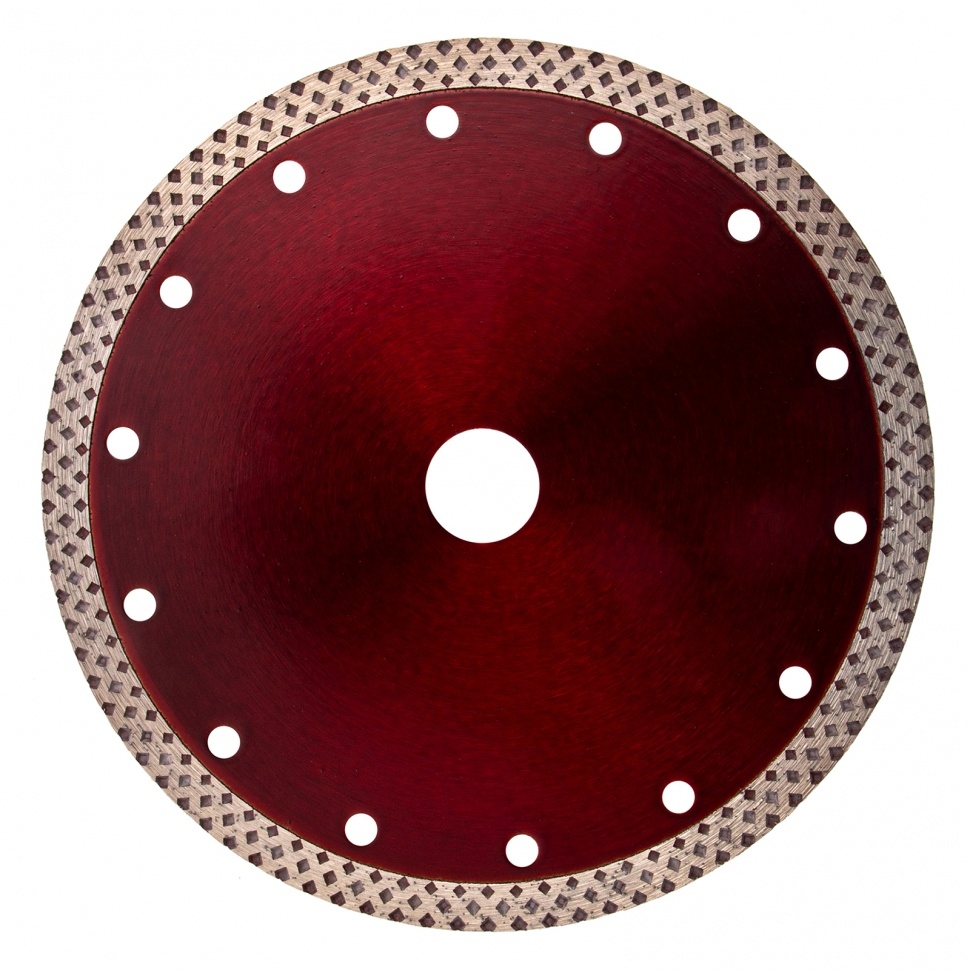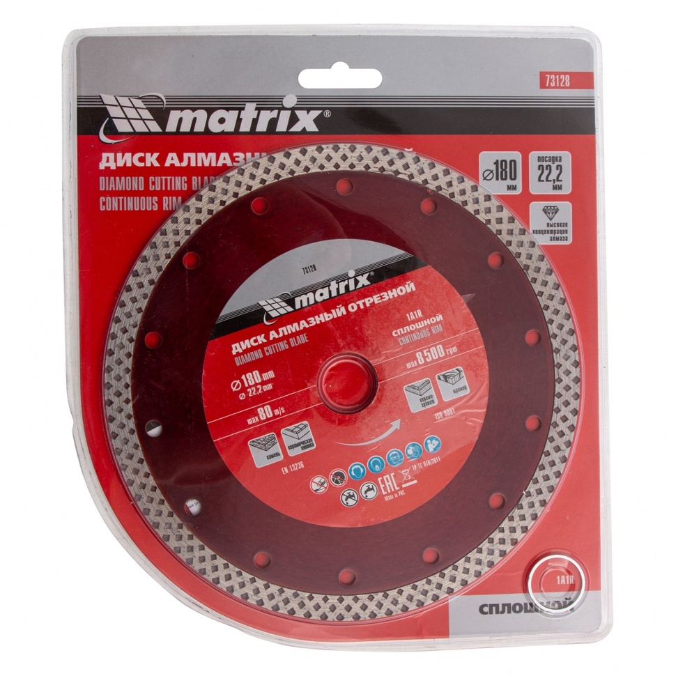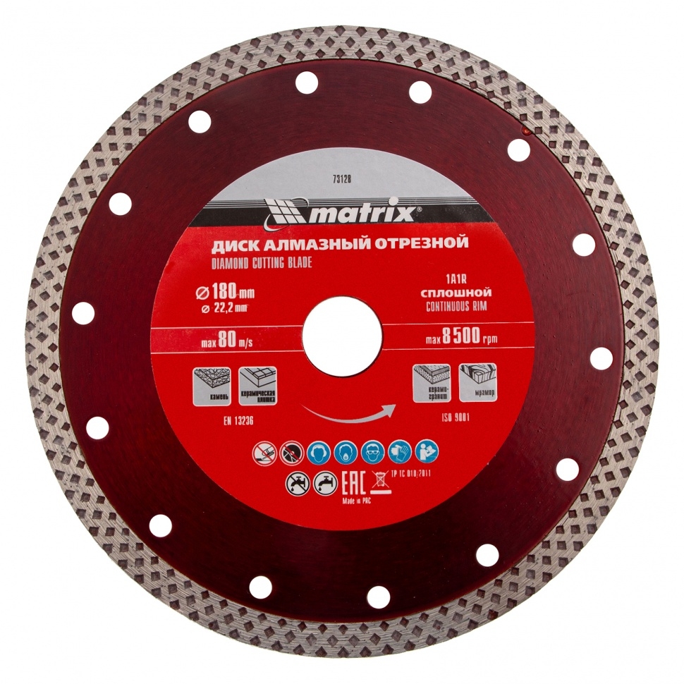 Отрезной алмазный диск Matrix 73128, сплошной, 180 мм &mdash оснастка для болгарок и плиткорезов с диаметром вала 22,2 мм. Он применяется для резки мрамора, искусственного и натурального камня, керамогранитной и керамической плитки. Использование без подачи воды расширяет возможности инструмента. Диск предназначен для бытового применения. Рекомендуется использовать водяное охлаждение для увеличения ресурса диска.Преимущества Благодаря высокой концентрации алмазов срез получается чистым и ровным. Режущая кромка шириной 10 мм способствует повышению производительности. Отверстия в корпусе диска способствуют активному охлаждению, что позволяет использовать диск для сухой резки. Диск выполнен нанесен методом холодного прессования, поэтому устойчив к механическим нагрузкам.