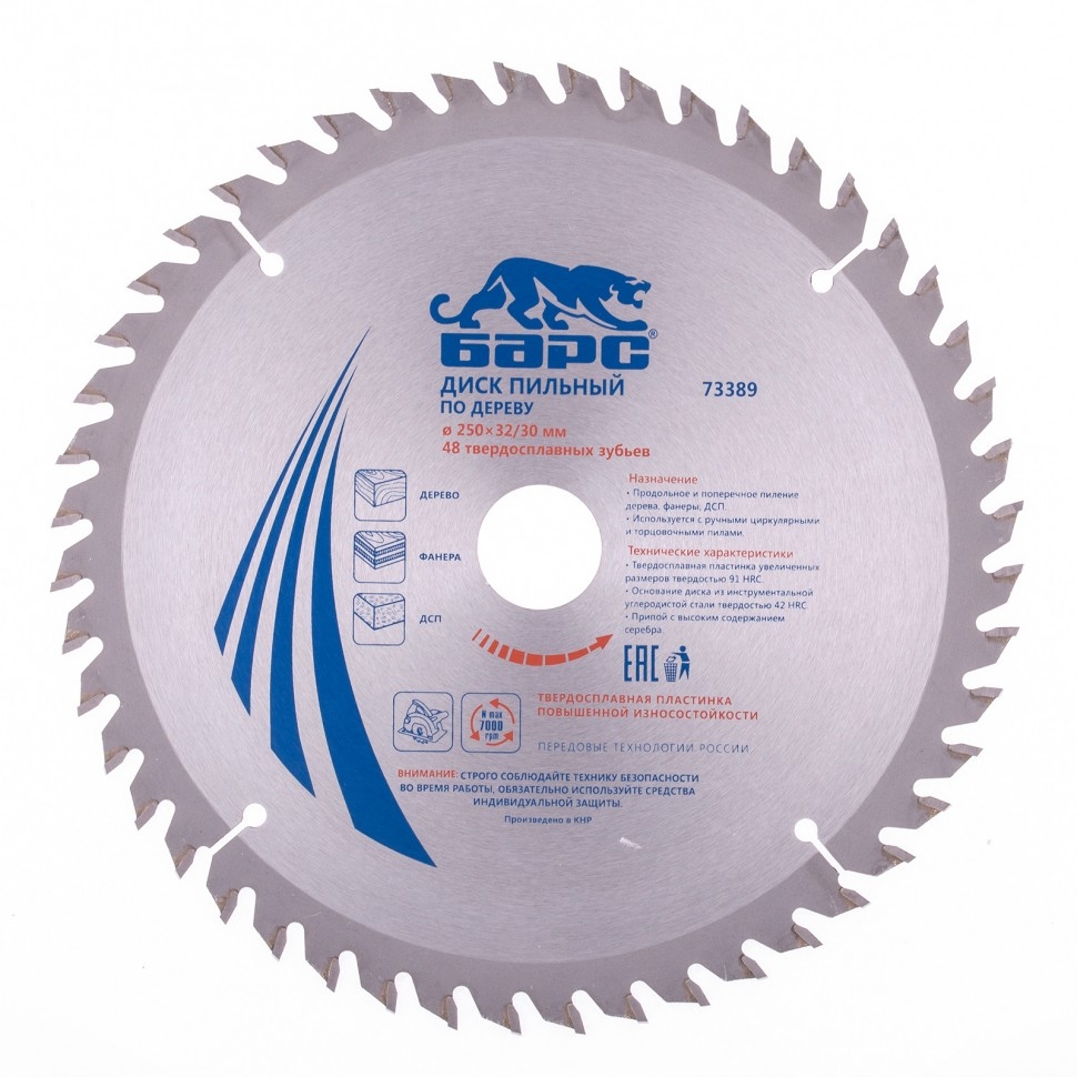 Диск пильный по дереву 250х32 мм 48 зубьев + кольцо 32/30 мм Барс