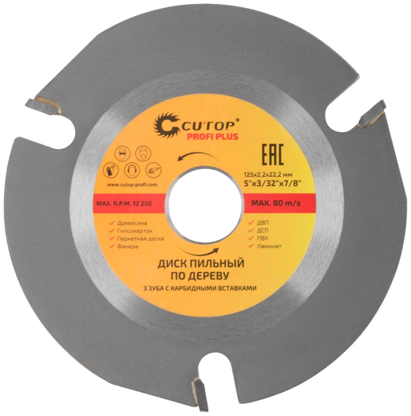 Диск пильный Cutop Profi Plus предназначен для использования совместно с УШМ и применяется для чистого и ровного реза древесины, гипсокартона, паркетных досок, фанеры, ДВП, ДСП, ПВХ, ламината. Диск имеет 3 твердосплавные напайки из карбида вольфрама, что обеспечивает: безопасность при высоких оборотах., устойчивость к деформации и воздействию температур. <br/>Материал: инструментальная сталь, зубья из карбида вольфрама. Упаковка: блистер.