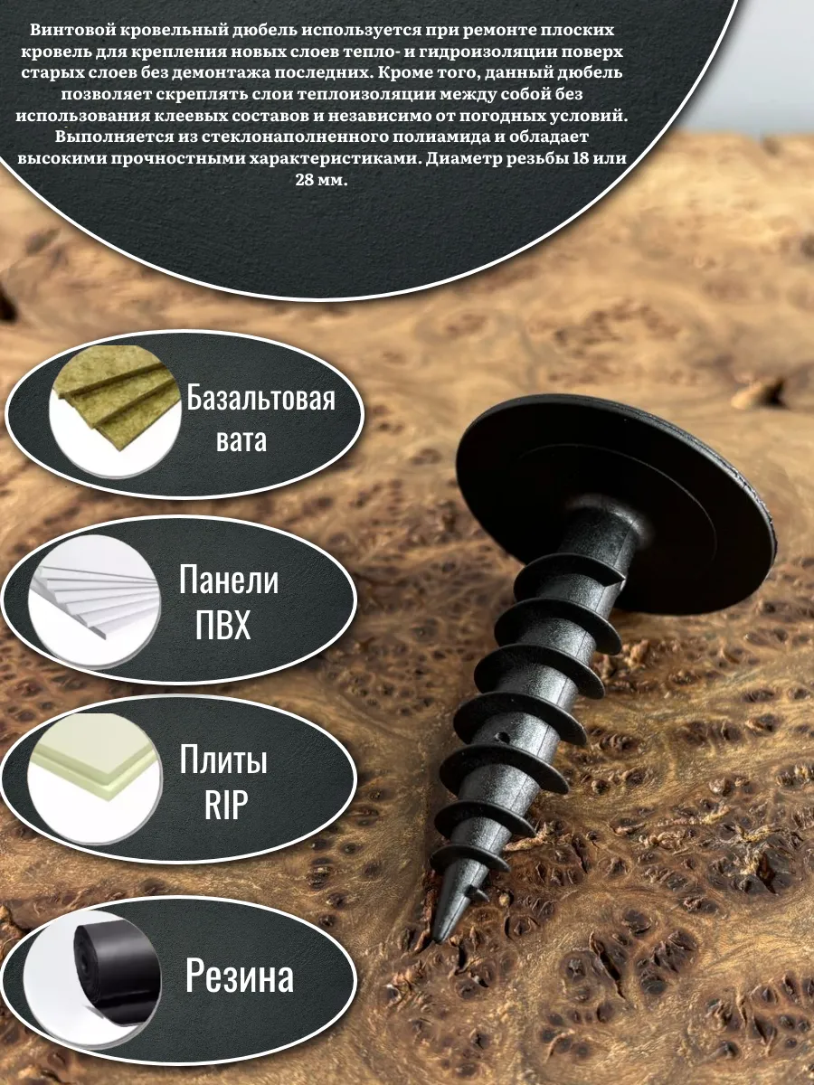 позволяет скреплять слои теплоизоляции между собой без использования клеевых составов и независимо от погодных условий. Выполняется из стеклонаполненного полиамида и обладает высокими прочностными характеристиками. Диаметр резьбы 18 или 28 мм.