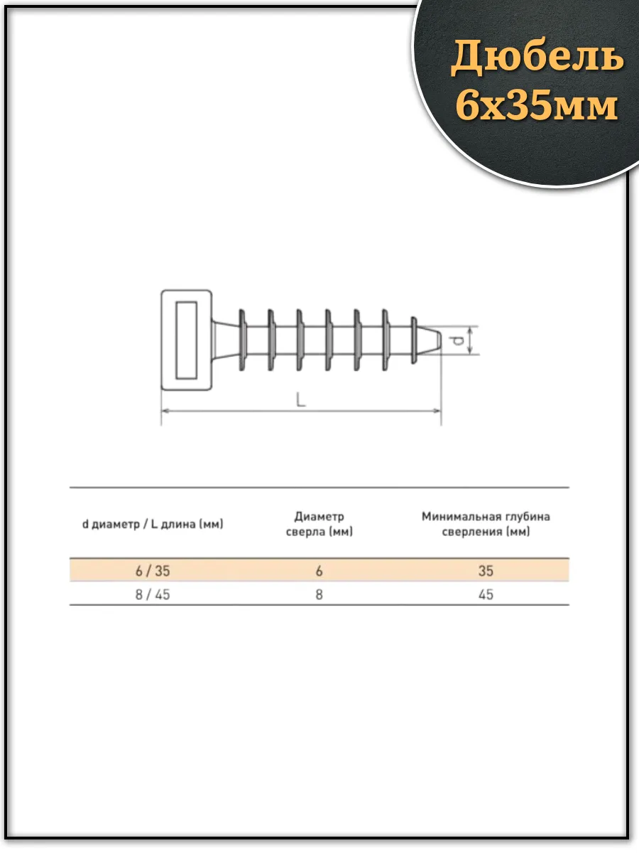 | Дюбель под кабельную стяжку хомут (нейлон) 6х35 мм, 50 шт. | 15-0350ф50 | 1 шт. |