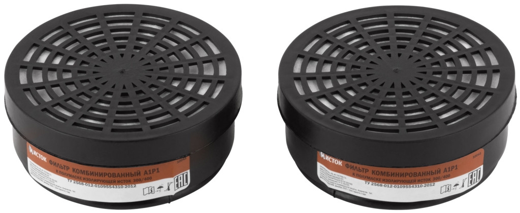 Набор 2 шт. Фильтр сменный противогазовый, для респиратора «ИСТОК-300/400» (РУ-60М) (А1Р1). Сочетает в себе две марки защиты. Марка "А" - защищает от органических паров или газов с температурой кипения выше 65 °С (бензин, бензол, керосин, ацетон, анилин, толуол, сероуглерод, различные спирты и эфир, и др.). Марка "Р" - защищает от всех видов аэрозолей (пыль, дым, туман). Материал: пластик, уголь активированный, полотно полиэфирное, полотно полипропиленовое.