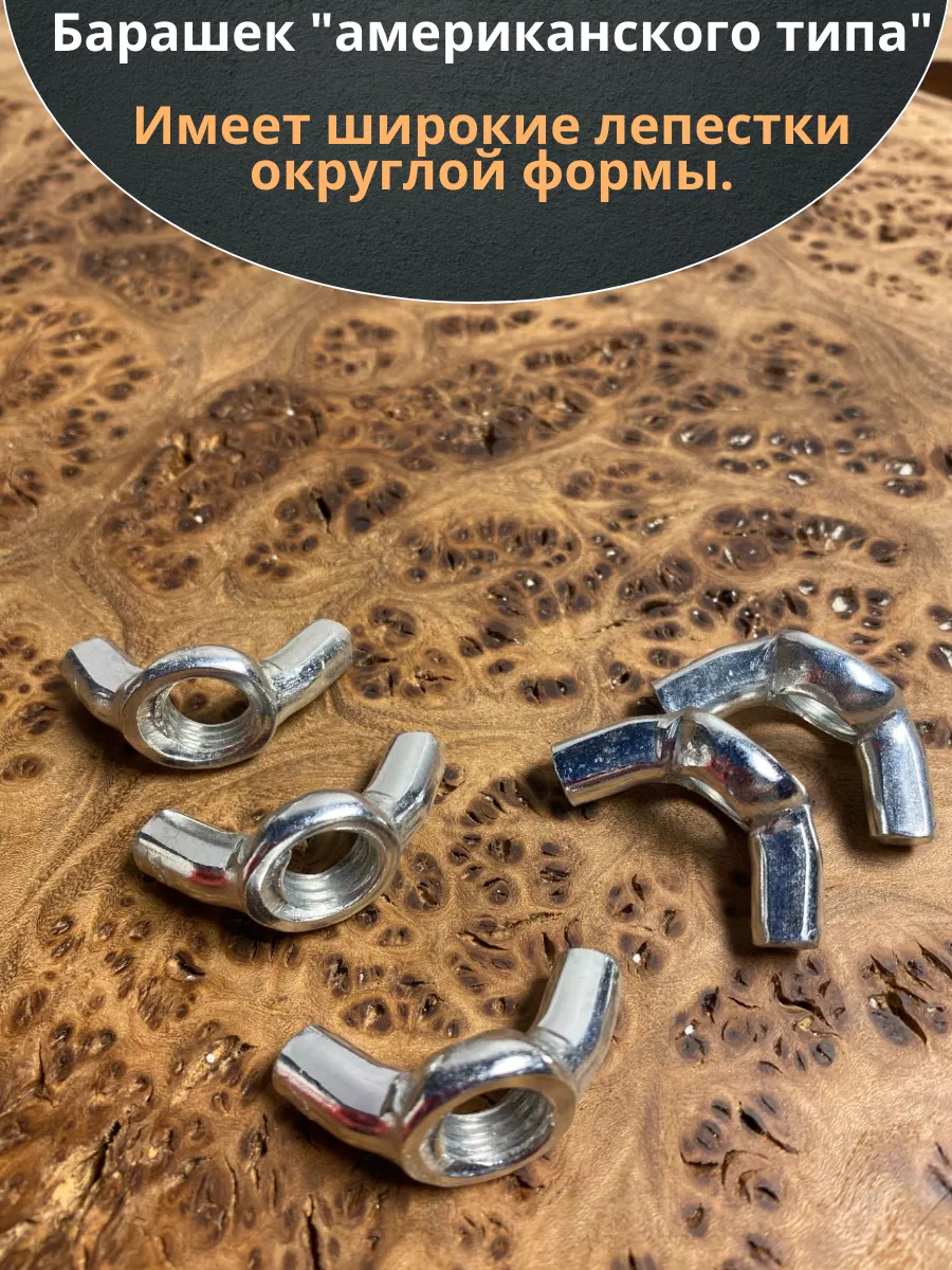 Гайка-барашек – крепежный элемент, имеющий в основе круглое отверстие с метрической резьбой, к которому крепятся два лепестка, вращение которых рукой позволяет затягивать или ослаблять крепление. Потребность в таком крепеже возникает в тех случаях, когда необходимо быстро затянуть или отпустить резьбу крепежа съемной детали, не являющейся элементом несущих конструкций. Изготавливается из оцинкованной или нержавеющей стали.