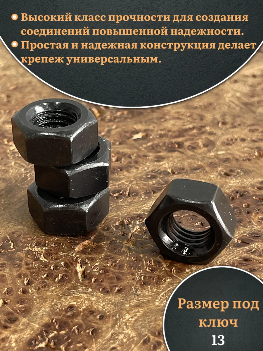 Гайка шестигранная высокопрочная, без покрытия DIN 934 используется с твердыми шайбами и черными калеными болтами соответствующего класса прочности 10 (10.9) для создания высоконагруженных соединений в строительстве, машиностроении и смежных областях. Изделие имеет нормальные размеры «под ключ» внешнего шестигранника от 7 до 80 мм, с обеих торцов сняты фаски. Размерный ряд включает диаметры резьбы М4 – М52, другие размеры изготавливаются под заказ. Гайки черные метрические высокой прочности 10 имеют повышенную стойкость к статическим, циклическим и ударным нагрузкам, устойчивы к перепадам температур, выдерживают многократные циклы монтажа / демонтажа без износа резьбы. Метиз не имеет антикоррозийного покрытия, поэтому для предотвращения преждевременной коррозии его целесообразно использовать в неагрессивных и сухих условиях внешней среды, а также в конструкциях под покраску или с невысокими требованиями к внешнему виду крепления.
