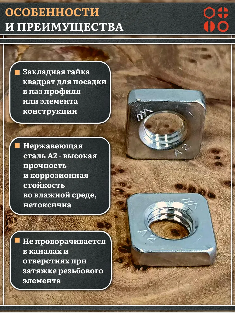 Квадратная гайка 10 DIN 562 из нержавеющей стали А2 используется для создания прочных резьбовых соединений в пазовых узлах. Её заранее помещают в специально подготовленный паз, чтобы предотвратить её проворот при вкручивании болта, винта или шпильки.