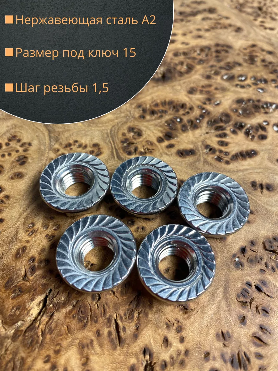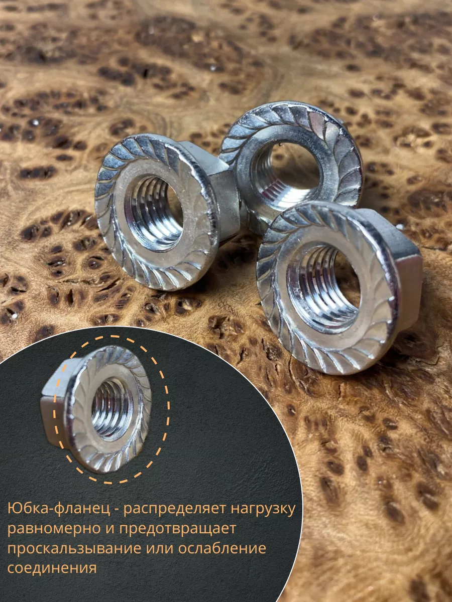 Гайка с фланцем это обычная шестигранная гайка в нижней части которой выполнено уширение (буртик) с насечками или без них. Применение гаек с фланцем значительно ускоряет процесс сборки, поскольку не требуется время на подкладывание шайбы. Фланец по диаметру больше гайки. Фланцевые гайки находят широкое применение в автомобилестроении, при производстве бытовых инструментов и техники, оборудования для пищевой, химической промышленности. Крепеж изготавливается из нержавейки А2 или А4, могут подвергнуть газотермическому цинкованию.