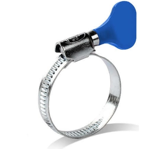 Хомут с ключом - это обычное крепление для шлангов червячного типа. Однако затягивание его производится без использования отвертки или гаечного ключа. Инструмент не требуется, так как его заменяет несъемный пластиковый или металлический ключ (также называемый барашком), прикрепленный к концу винта. Благодаря прочности пластика допускается значительное усилие при затягивании. Хомут червячный с барашком многоразовый, может неоднократно сниматься и снова использоваться по назначению.
