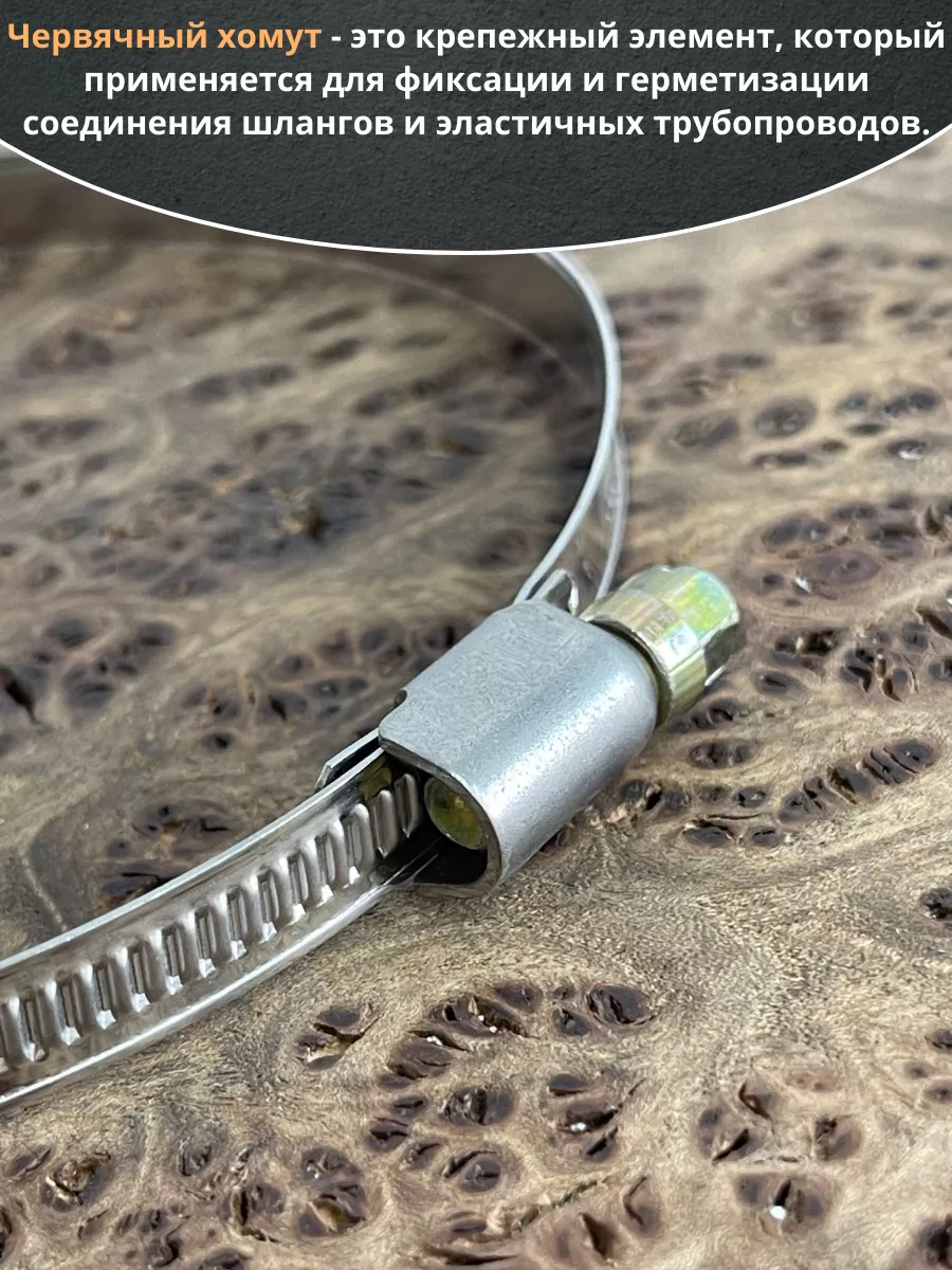Хомут червячный используется для соединения, крепления или фиксации жестких и гибких трубопроводов, шлангов и патрубков. Изготавливается из стали в виде ленты со специальным замком. Одна половина ленты гладкая, а вторая рифленая, что гарантирует надежную фиксацию. Срок службы данного изделия напрямую зависит от правильного выбора соединения и степени подвижности.