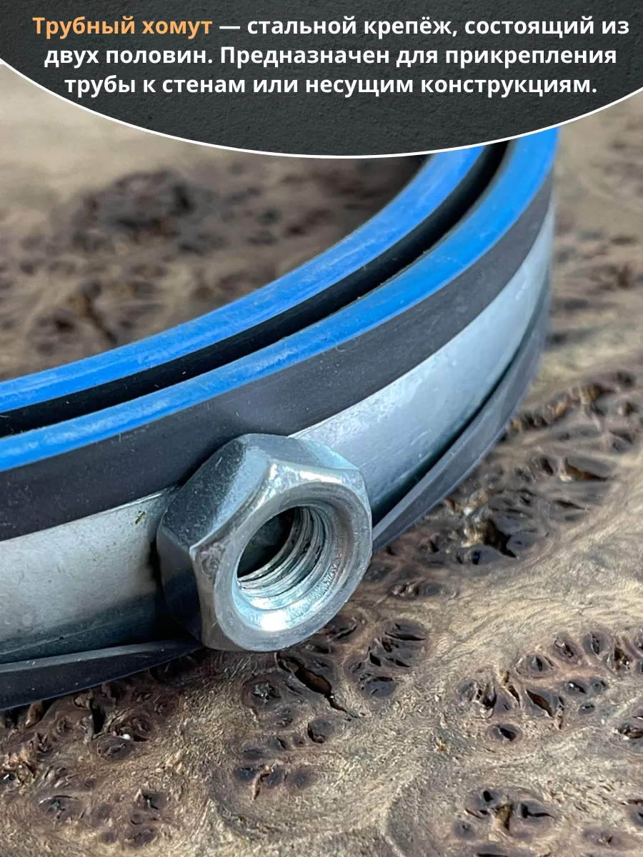 Хомут изготавливается из стали, прокладка - из высококачественной резины. Все металлические детали в обязательном порядке оцинковываются. С помощью трубного хомута трубы могут фиксироваться на полу, стенах или потолке. Данный вид хомута предназначен для надежного крепежа трубопроводов. Используется в сантехническом деле. Пользуется большой популярностью, за счет гарантии надежной фиксации. Материал основания: древесина, металл, бетон, кирпич