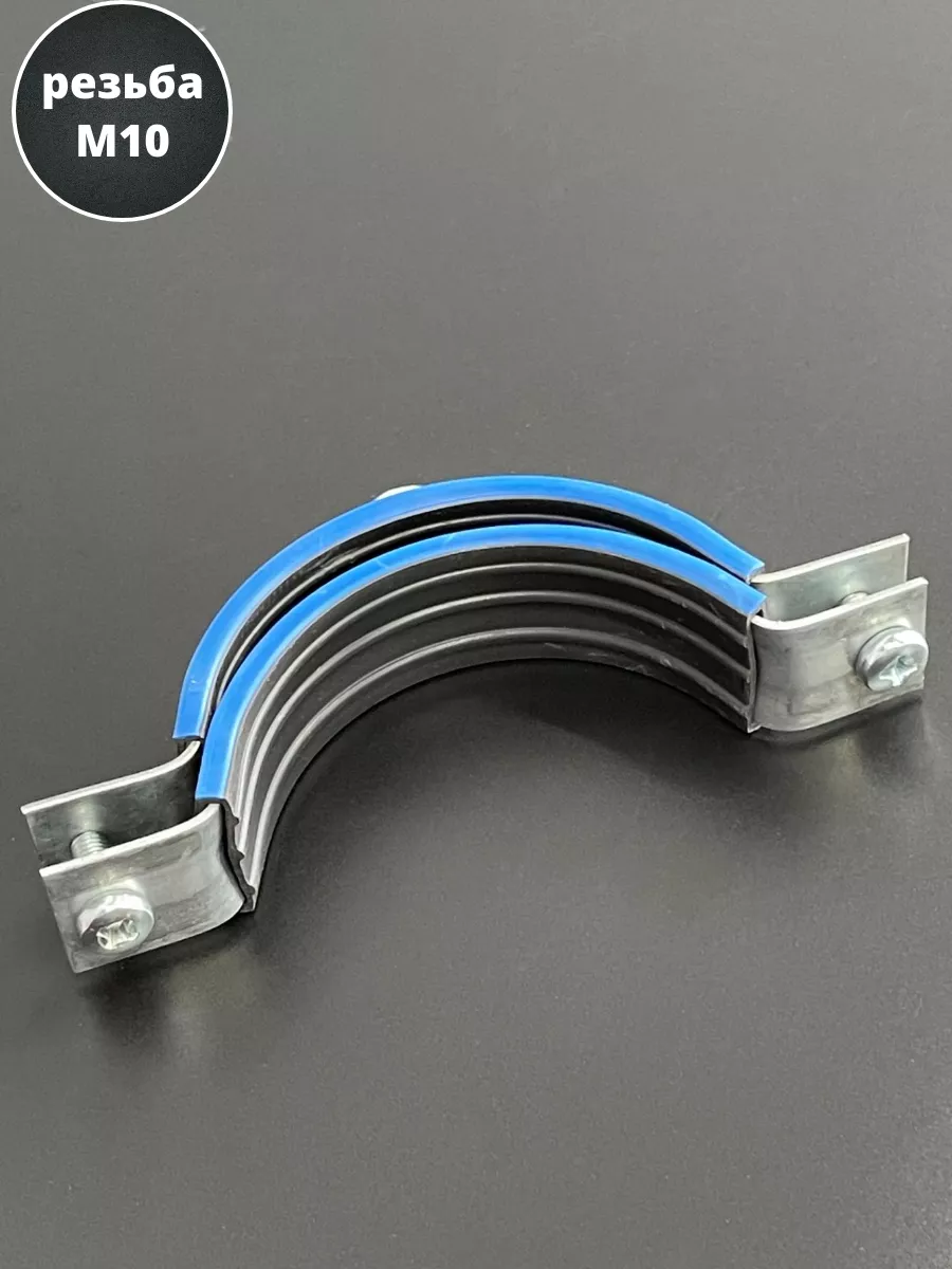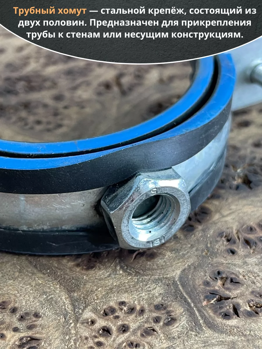 Хомут изготавливается из стали, прокладка - из высококачественной резины. Все металлические детали в обязательном порядке оцинковываются. С помощью трубного хомута трубы могут фиксироваться на полу, стенах или потолке. Данный вид хомута предназначен для надежного крепежа трубопроводов. Используется в сантехническом деле. Пользуется большой популярностью, за счет гарантии надежной фиксации. Материал основания: древесина, металл, бетон, кирпич