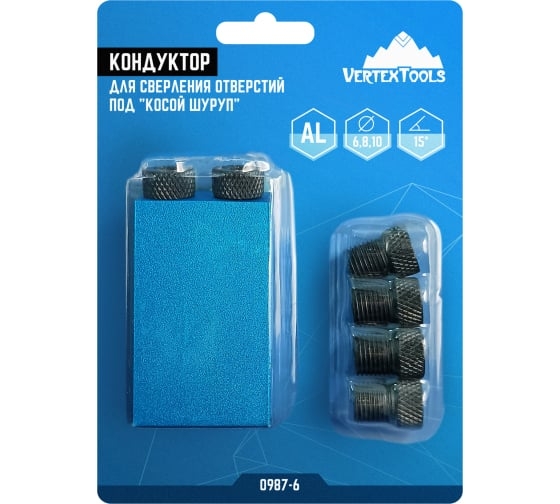 Кондуктор для сверления отверстий под косой шуруп vertextools 0987-6 применяется для быстрого, точного и надежного соединения деревянных деталей. При помощи кондуктора и сверла делается отверстие в одной детали под углом 15 градусов, которая затем прикручивается саморезами ко второй детали. Для использования также нужна струбцина (в комплект не входит).