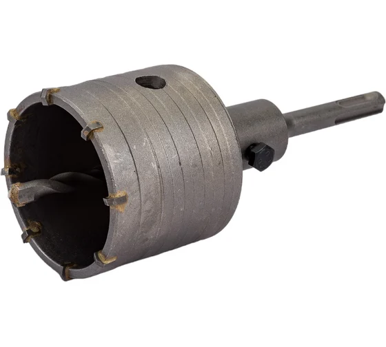 Коронка в сборе по бетону (50 мм) Vertextools 222-0050 изготовлена из углеродистой стали. Для твёрдосплавных зубьев используется сплав марки ВК8. На внешней поверхности коронки имеется специальная спиральная канавка для вывода продуктов сверления, что позволяет снизить нагрузку на перфоратор.