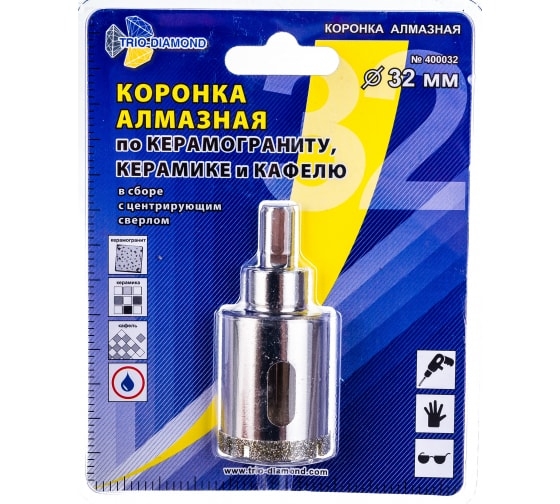 Коронка с центрирующим сверломTrio Diamond Ø32 мм изготовлена методом вакуумной пайки. Используется для сверления кафеля, керамики и стекла. Коронка имеет цилиндрический хвостовик. Встроенное центрирующее сверло способствует точному позиционированию при выполнении работ. Посадочное отверстие - 10 мм. Максимальная глубина сверления - 30 мм. При эксплуатации инструмента в зону реза должна подаваться вода. Применяется для работы на сверлильных устройствах.
