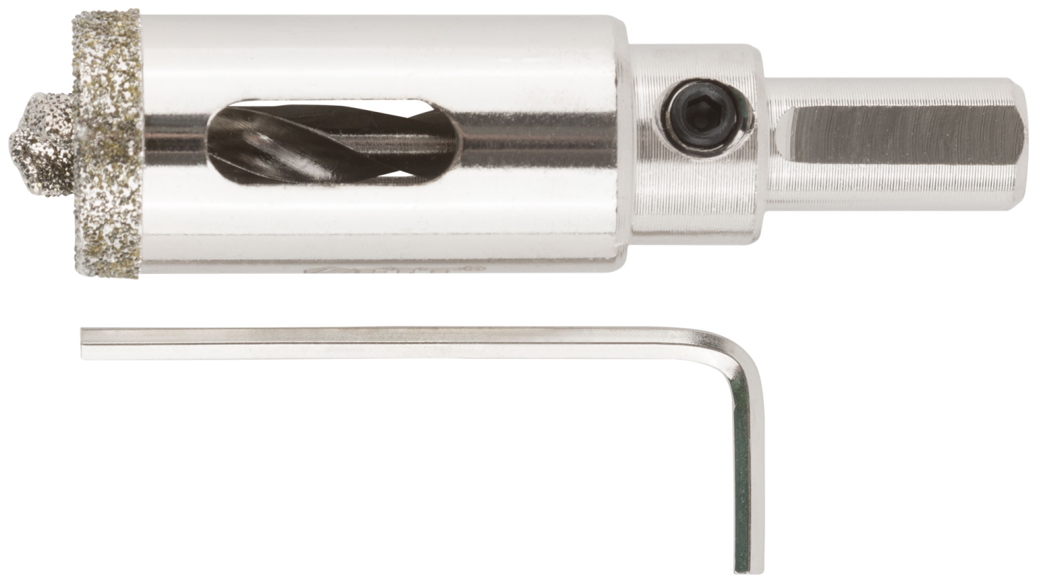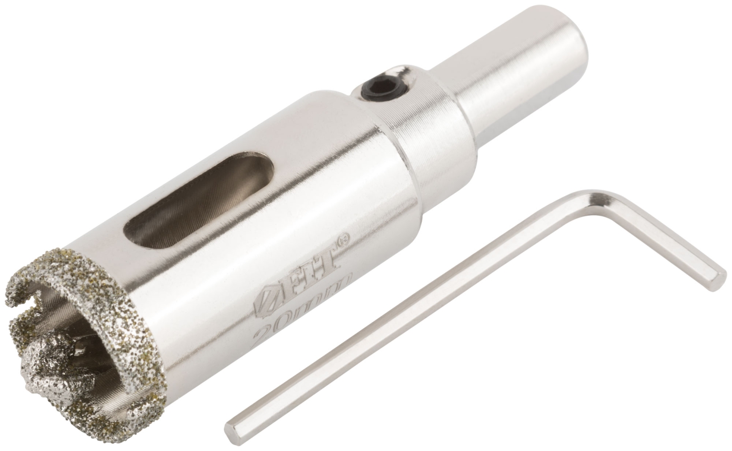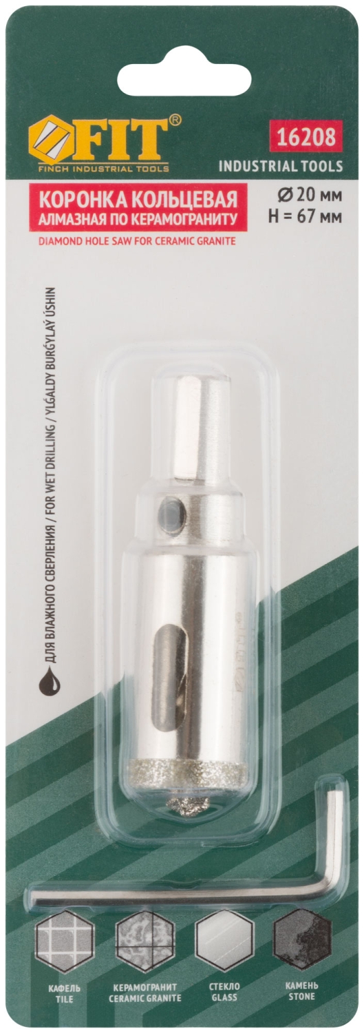 Трехгранный хвостовик. Идут в комплекте с центрирующим сверлом и шестигранным ключом. Для вырезания круговых отверстий в керамограните, камне, стекле, кафельной плитке. Влажное сверление. Глубина пропила 40 мм. Материал: инструментальная сталь, режущая кромка содержит порошок из технических алмазов. Упаковка: блистер.