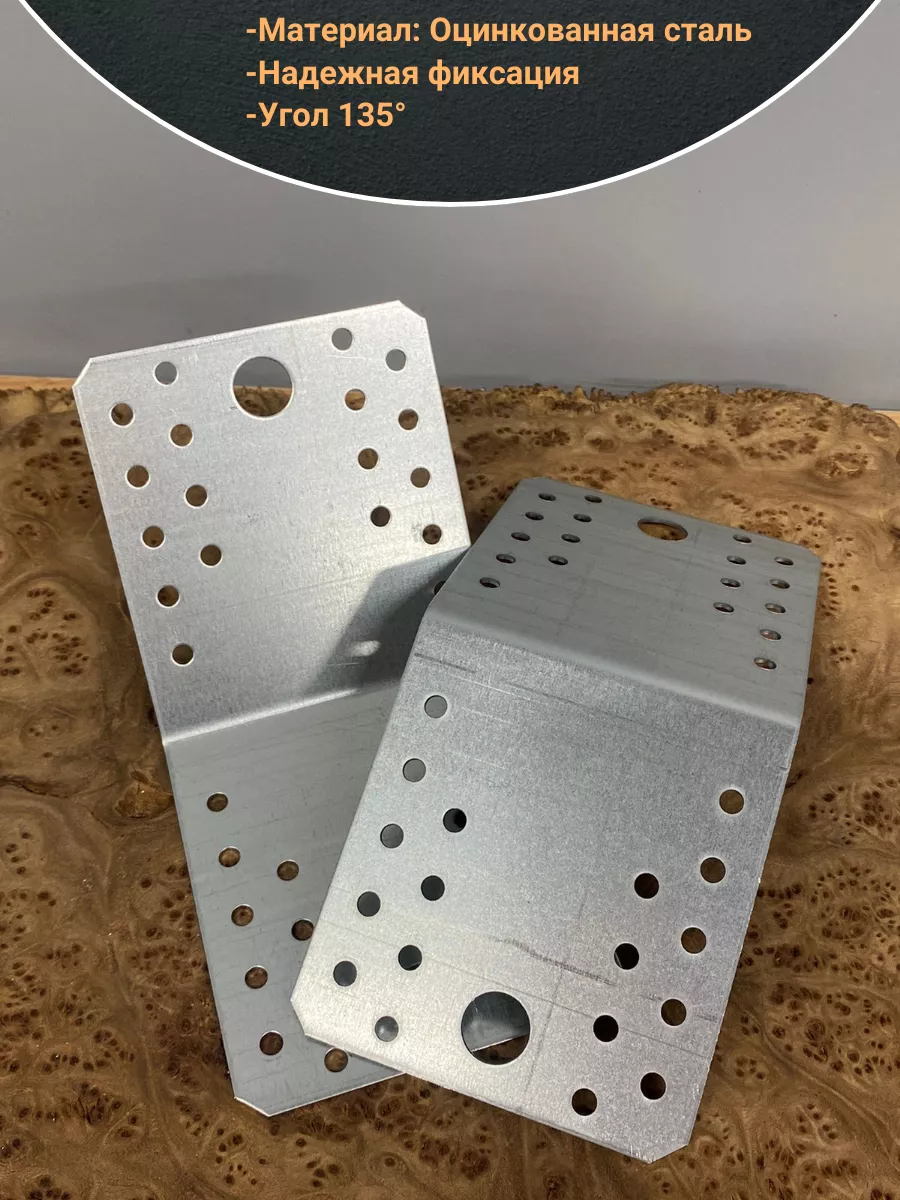 Материал: Оцинкованная сталь. Уголок крепежный под 135 градусов применяется в тех случаях, когда крепление необходимо проводить не под стандартным углом в 90 градусов, а в тех случаях, когда угол ровняется 135 градусам. Чаще всего используется для крепления стропил из дерева к основанию из кирпича или бетона. Изготавливается уголок из стали холодной накатки, визуально представляет 2мм пластину загнутую под углом в 135 градусов с различными отверстиями для крепежа. Данный вид крепежа не пользуется большой популярностью, так как имеет отличный от стандарта угол, но для углового крепления в 135 градусов, у него идеальные характеристики. Материал основания: Дерево, кирпич, бетон
