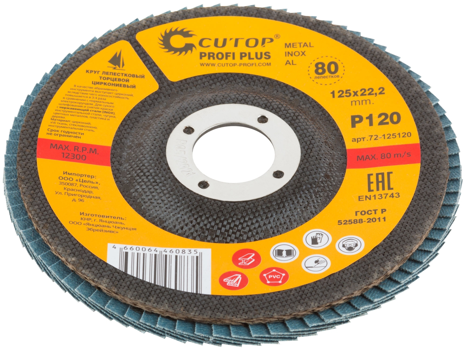 При изготовлении используется высококачественный гибкий абразивный материал состоящий из тканевой основы на которую нанесен слой циркониевого электрокорунда. Круги на основе циркониевого электрокорунда имеют высокую прочность, коэффициент шлифования на кругах данного типа выше в несколько раз, чем у кругов на основе нормального электрокорунда, что особенно эффективно при работе с особо твёрдыми сортами металла. Структура циркониевого электрокорунда даёт эффект самозатачивания, что также увеличивает ресурс использования. Наполняемость диска составляет 80 лепестков с углом наклона 10 градусов, это позволяет увеличить КПД круга и его стойкость к износу в несколько раз. Предназначен для обработки нержавеющей стали, металла, сварных швов, пластика, дерева. Для углошлифовальных машин. Посадочный диаметр 22,2мм.