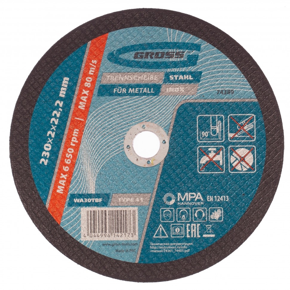Отрезной круг по металлу Gross WA36TBF 74389, 230 х 2,0 х 22,2 мм, рассчитан на интенсивный сухой рез нержавеющих легированных и углеродистых сталей. Устанавливается на УШМ соответствующего типоразмера. Надежный и производительный, круг подходит для профессиональной эксплуатации с высокими нагрузками. Абразив из монокорунда с добавками зерно обладает высокой твердостью и прочностью, подтачивается в процессе работы, поэтому эффективность реза не снижается. Очень высокий ресурс в бакелитовую связку и абразив включены специальные добавки. Безопасность работы высококачественная двухслойная стеклосетка защищает круг от перегрузок, предотвращая его разлет в случае зажатия в материале. Специальный состав круг слабо нагревается в процессе реза, износ происходит медленно и равномерно, поэтому образуется минимальное количество пыли и искр. Толщина 2 мм и крупный абразив F36 износостойкий круг легко выдерживает интенсивное использование.