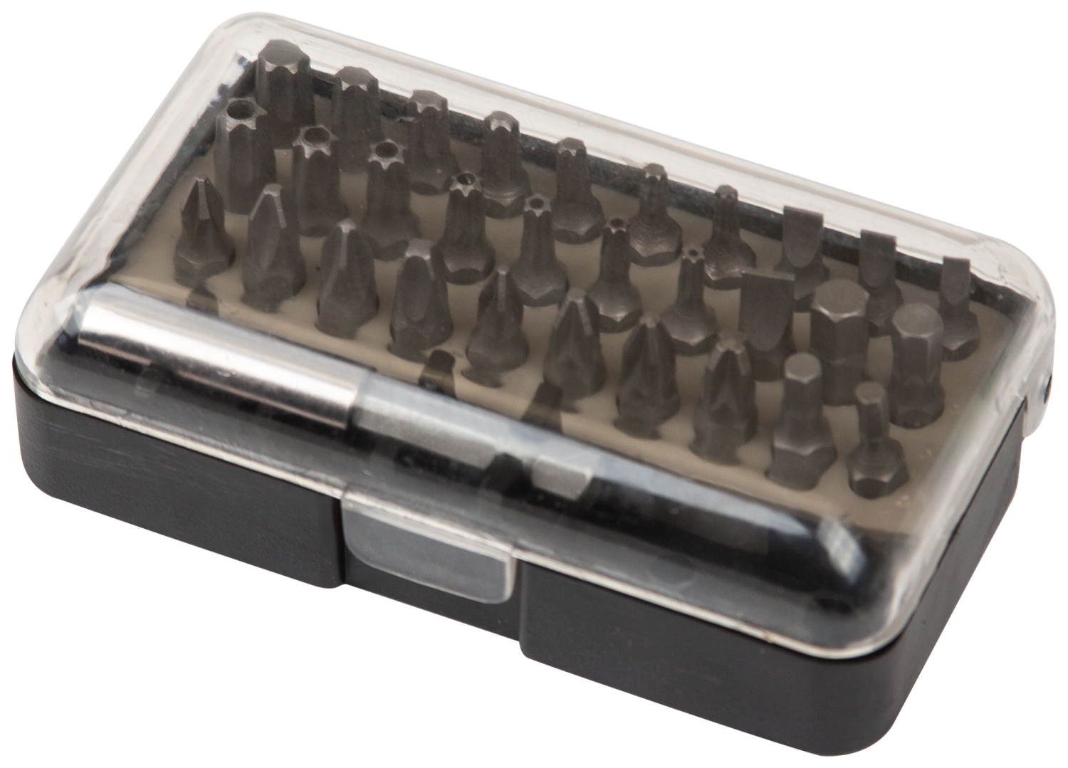 В наборе: 30 бит из хром-ванадиевой стали + адаптер для бит с надежным захватом. Биты: PH1, PH2, PH2, PH3, PZ1, PZ2, PZ2, PZ3, SL3, SL4, SL5, SL6, H3, H4, H5, H6, T10, T15, T20, T25, T27, T30, T40, «TORX» с отверстием: T10, T15, T20, T25, T27, T30, T40.