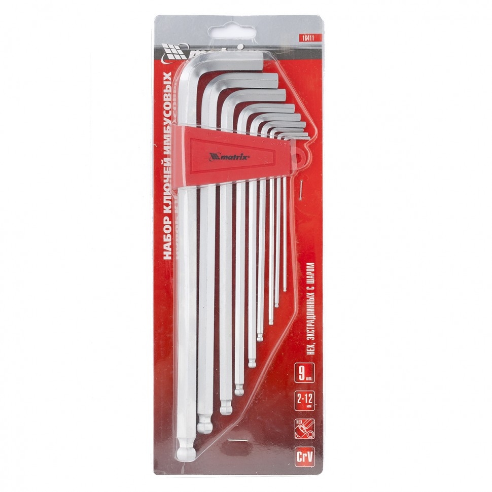 Набор экстра-длинных имбусовых ключей Matrix 16411 с шаром и сатинированным покрытием, 9 шт., CrV, предназначен для монтажа и демонтажа болтов с профилем HEX 2-12 мм. Шлиц с внутренним шестигранником чаще всего встречается при сборке мебели и ремонте велосипедов. С экстра-длинными ключами Г-образной формы легче работать, в том числе и в труднодоступных местах. А наконечники в виде шариков позволяют производить монтаж/демонтаж метизов под углом.