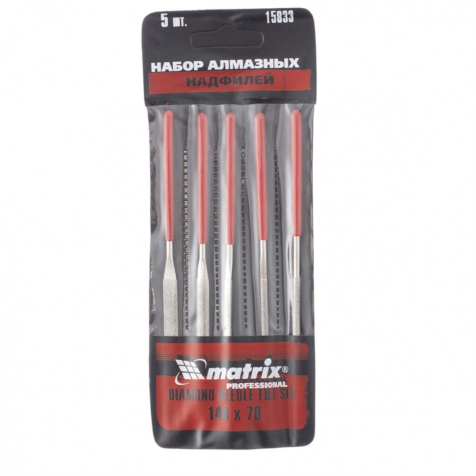 Набор алмазных надфилей Matrix 15833 из 5 шт., 140 x 70 x 3 мм, предназначен для точных работ и используется для доводки и зачистки мелких деталей. Подходит для обработки металлических, стеклянных, керамических поверхностей. Набор универсален, т.к. в него входят надфили с разными сечениями профилей, что позволяет опиливать ровные поверхности, а также углы, пазы, отверстия, округлые выступы. Надфили пригодятся в слесарном деле, при занятиях моделированием, будут полезны и в быту. Преимущества Надфили изготовлены из высокоуглеродистой стали, поэтому характеризуются твердостью и износостойкостью. Напыление из алмазной крошки обеспечивает высокие абразивные свойства надфилей. Рукоятки обрезинены и не скользят в руке, что повышает комфорт по время работы. Красный цвет рукояток хорошо заметен, поэтому инструменты не затеряются в рабочем пространстве.