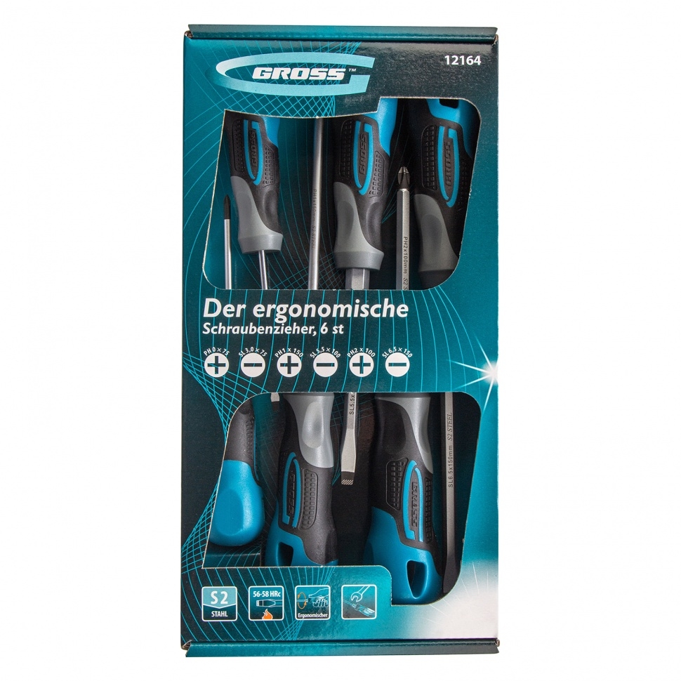 Набор отвёрток 6 шт S2 GROSS 12164 используют для ремонтных работ. В набор входит шесть стальных отверток разных размеров. Они имеют эргономичную рукоятку и стержень с намагниченным наконечником, который обеспечивает плотное соприкосновение с головкой крепежа.