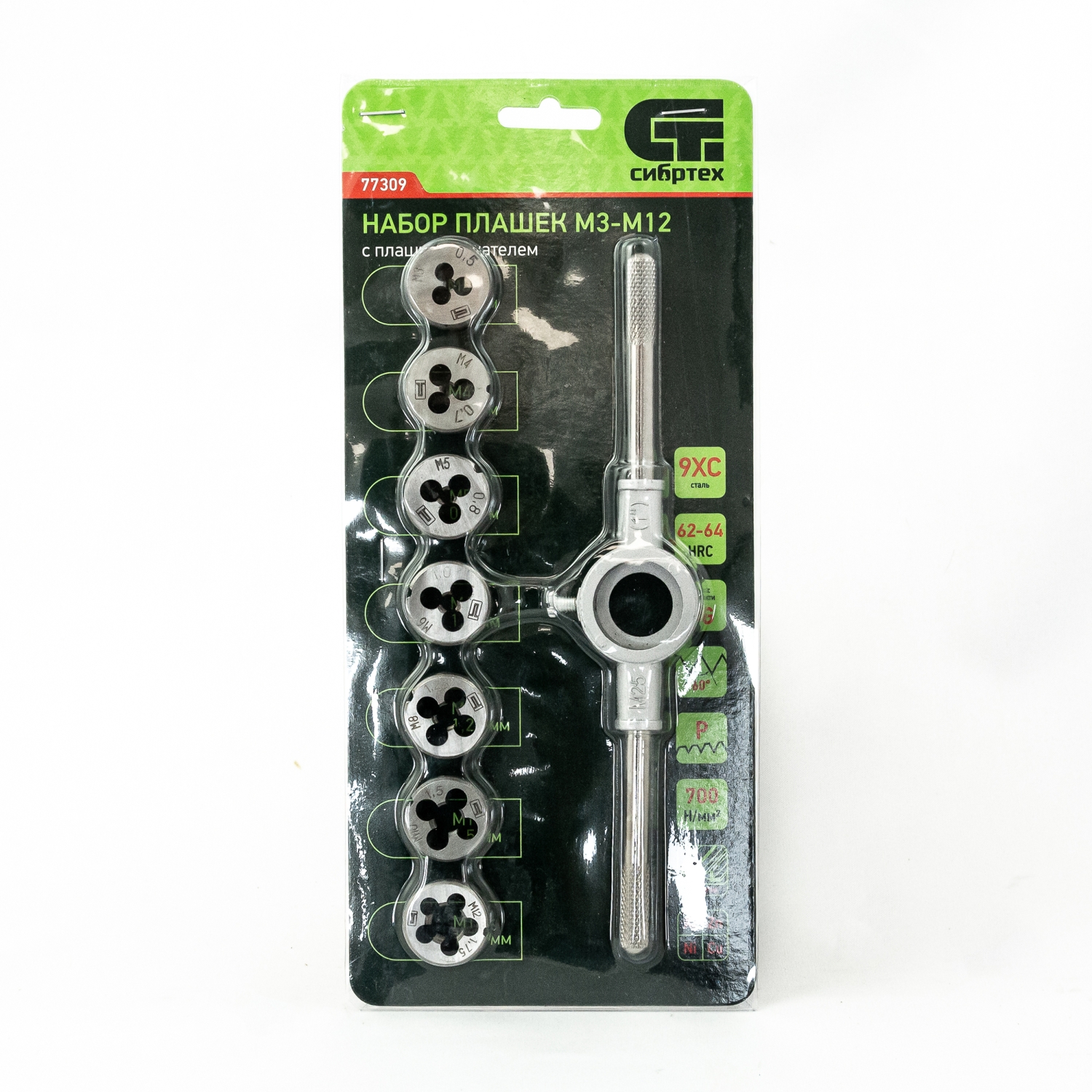 Набор плашек Сибртех 77309, М3-М12, 8 предметов, применяется для нарезания внешней резьбы. Он рассчитан на работу с металлическими и стальными изделиями с пределом прочности 800 Н/мм2. Набор пригодится мастерам для скрепления различных деталей при проведении ремонта авто, бытовой техники, строительных работ. Надежный и долговечный набор — плашки выполнены из легированной инструментальной стали 9XC и закалены до твердости 59-62 HRC.