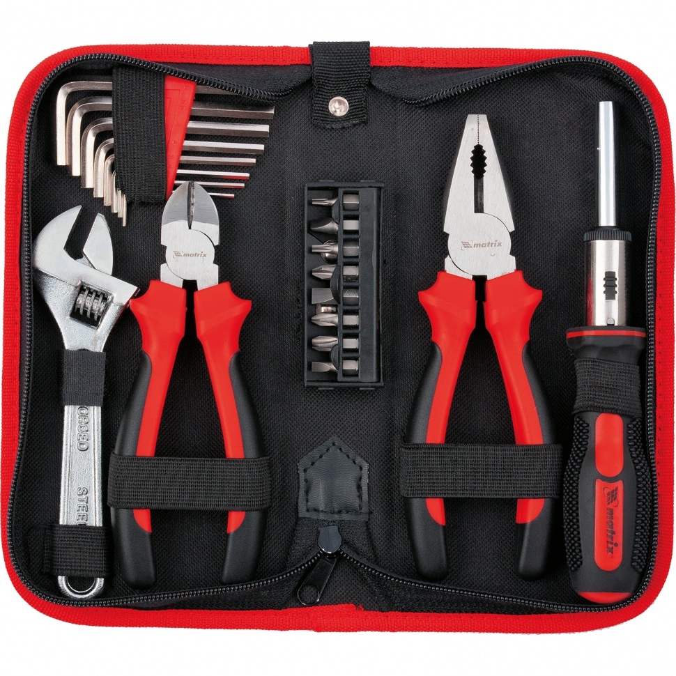 Слесарно-монтажный набор Matrix 13561, 22 предмета, оптимально подходит для бытового и профессионального использования. Универсальный набор содержит ключи-шестигранники для удобства работы в труднодоступных местах, разводной ключ для монтажа/демонтажа болтов и гаек, реверсивную отвертку с битами и переходником для работы с крепежными элементами, бокорезы и плоскогубцы для зажима и сгибания заготовок.