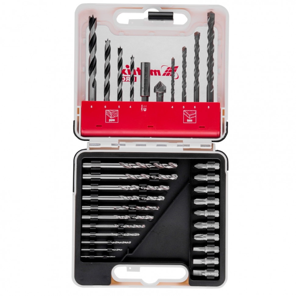 Комбинированный набор Matrix PRO 725631 — это универсальное решение для мастеров, т.к. он содержит 31 предмет: отверточные биты (10 шт.) и адаптер к ним, зенковку и сверла по дереву 4-8 мм, сверла по бетону 4-8 мм и сверла металлу 1-6 мм. Оснастка соответствует высоким стандартам качества, поэтому рассчитана как на использование в быту, так и на решение профессиональных задач. Качественное исполнение деталей набора гарантирует их высокий ресурс: торцевые головки и зенковка выполнены из углеродистой стали, сверла по металлу из стали Р6М5, а сверла по дереву — из стали 45. Сверла по бетону характеризуются долговечностью и износостойкостью, т.к. изготовлены из стали 40Х и имеют твердосплавную пластину ВК8. Биты из прочной стали CrV имеют высокий ресурс и стойкость к коррозии. Благодаря цилиндрическим хвостовикам сверла подходят для большинства дрелей и шуруповертов. Магнитный адаптер позволяет легко и быстро менять биты, что удобно при работе с различными насадками.